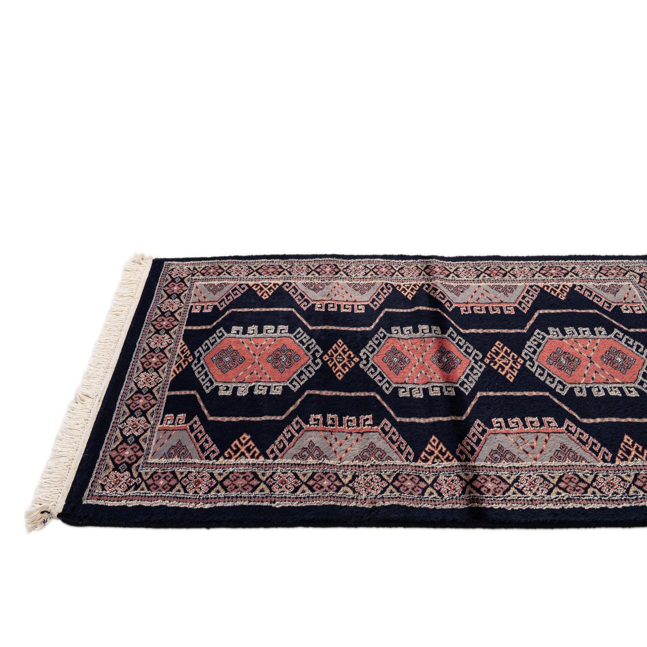 A 3x5 rectangular Bokhara rug with a navy blue field and traditional tribal patterns in red, grey, and beige, featuring decorative fringes.
