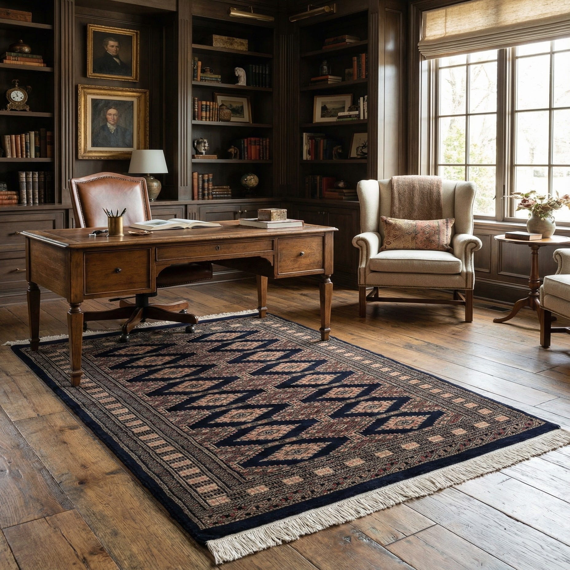 A 3x5 rectangular Bokhara rug featuring a traditional tribal pattern in navy blue, red, and beige, with fringe.