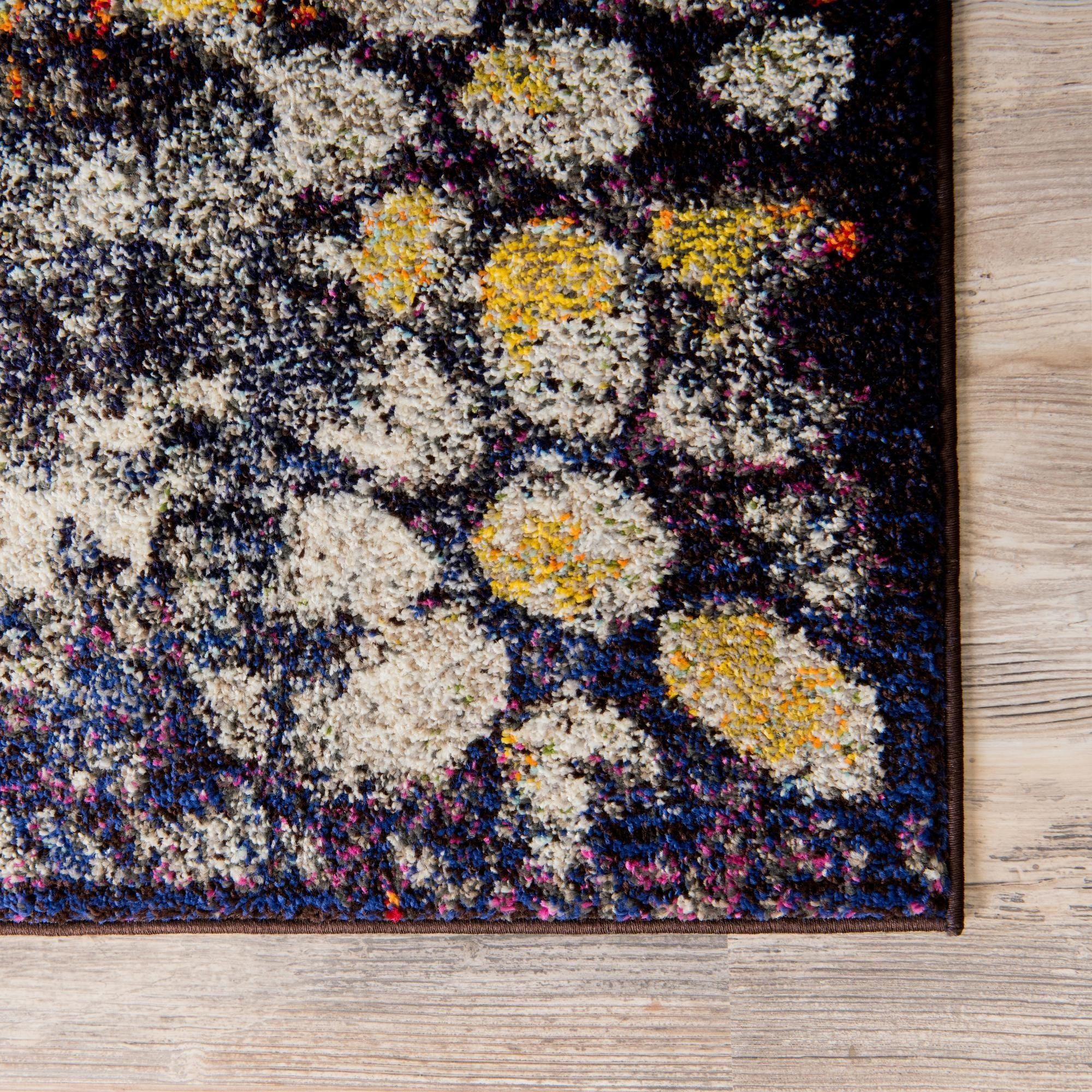 Abstract, painterly patterning unfolds across a deep navy blue background, where mottled floral-like clusters and speckled dots form a layered, distressed composition. Ivory areas punctuate the dark field while pops of yellow and orange introduce warmth, and accents of blue, black, brown and gray add depth and contrast. Machine-made from 100% polypropylene, the rug has a low-to-medium pile with a soft hand and a subtle luster that highlights the layered colors and texture.