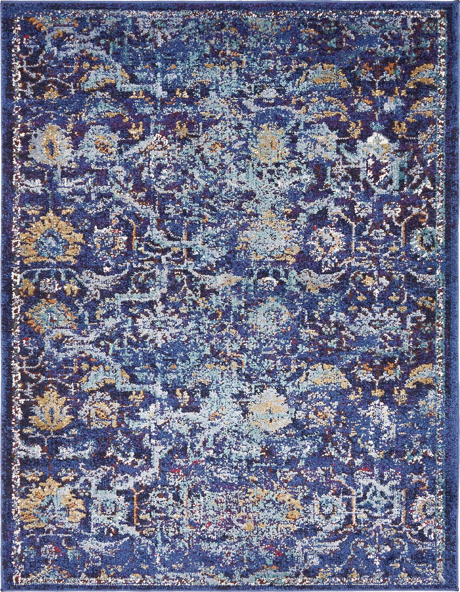 The color palette is grounded in a deep Navy Blue background, complemented by accents of Black, Beige, Ivory, Tan, Orange, and Purple hues. These colors combine harmoniously to produce a versatile piece that can bridge various decor styles. The rug's stain-resistant property ensures easy maintenance, while the shed-free feature promises a neat appearance over time.