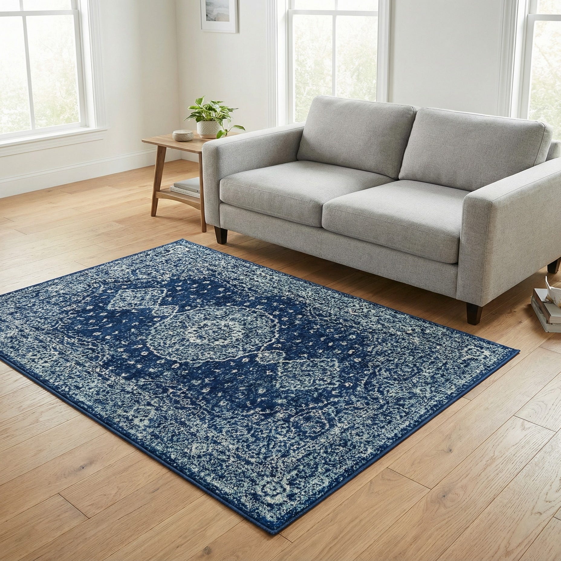 This rug works well where you want a touch of traditional character without feeling formal. Pair it with light-wood furniture and crisp white linens for a coastal or transitional look, layer it under a small seating group or in an entryway to add color and pattern, or place it beside a bed to warm hardwood floors. Navy, blue, and ivory make it easy to coordinate with brass or aged-metal accents, neutral upholstery, or denim and chambray textiles for a relaxed, pulled-together space.