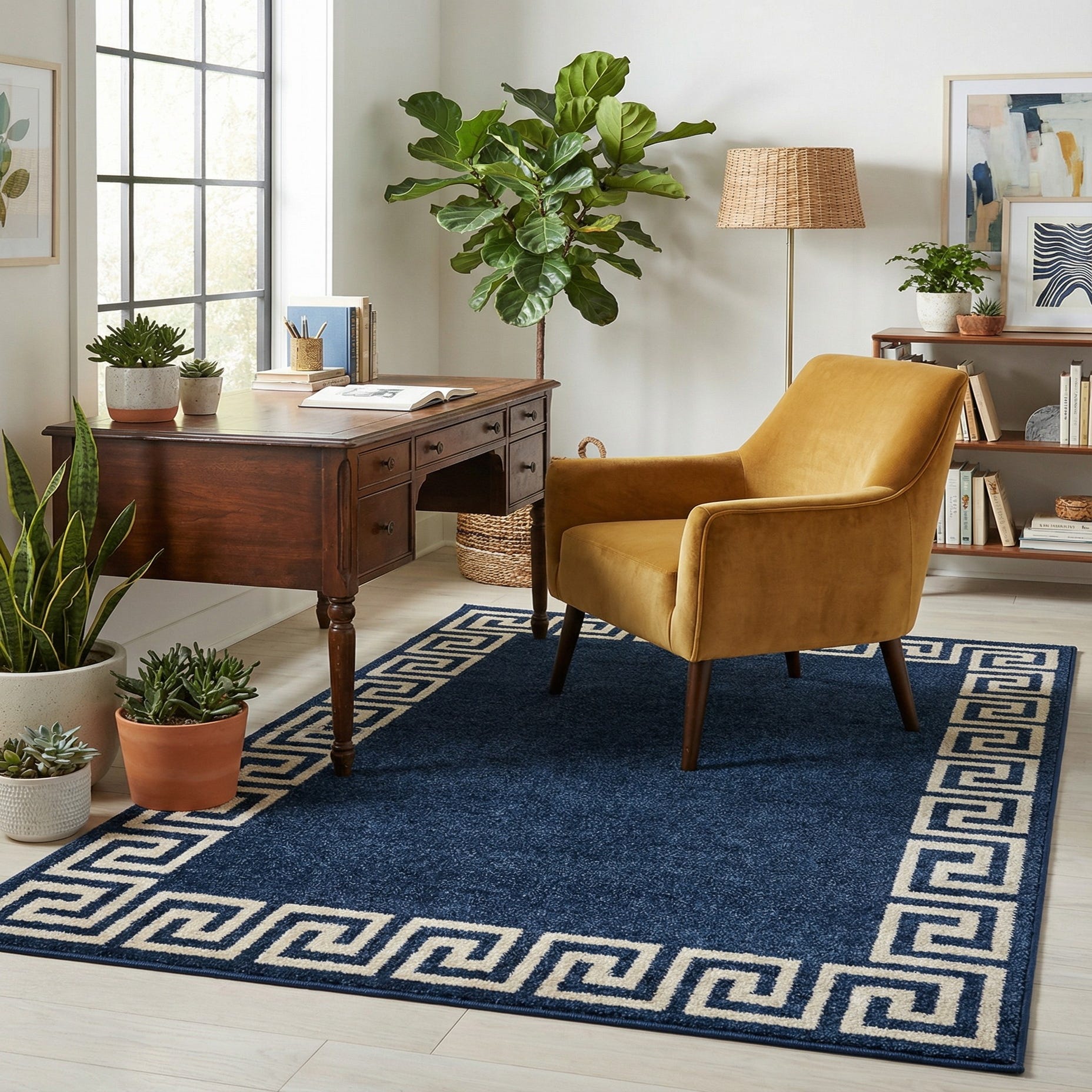Well-suited for entryways, small seating areas, or layered in front of a sofa, this rug pairs naturally with light woods, cream upholstery, and brass or matte black accents. It complements transitional and modern-traditional interiors as well as coastal or Neoclassical-inspired schemes, providing a steady, grounding element beneath patterned throw pillows or simple, tailored furniture.