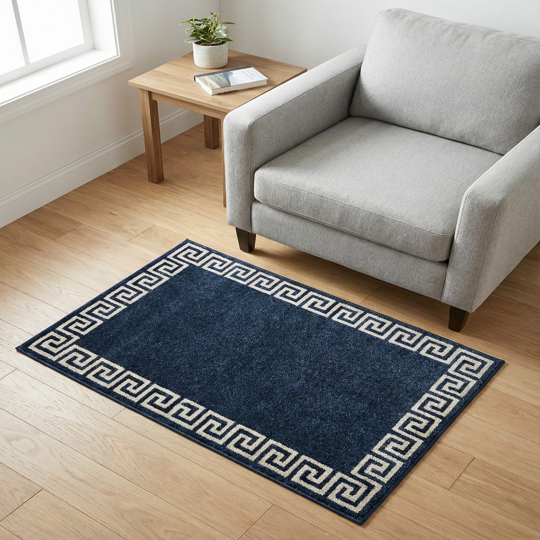 A deep navy field anchors a crisp beige Greek key border, creating a clean, architectural look with a timeless feel. The repeating geometric motif gives the rug a structured, classical presence while the solid center keeps the overall effect modern and restrained. Machine-made from 100% polypropylene, the pile is tightly constructed and has a soft, slightly lustrous hand that feels cushioned underfoot while holding a defined surface texture.