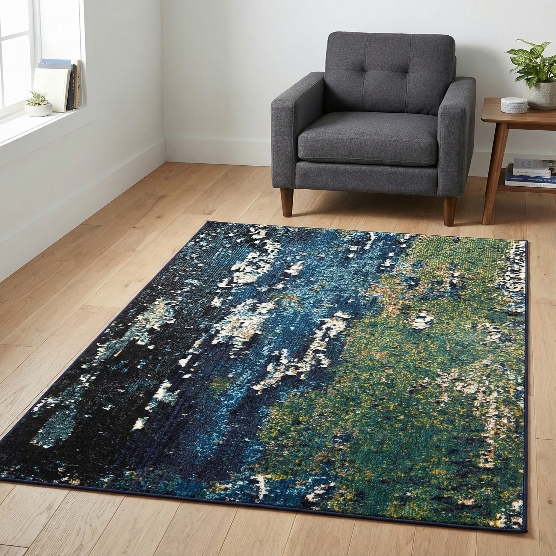 With its vibrant color palette and bold design, this rug would complement modern and contemporary interiors especially well. It has the versatility to act as an artistic statement in a minimalist setting or to harmonize with a more eclectic mix of decor elements. It could serve as an anchoring piece in a living room, uplift a home office with its lively pattern, or add visual interest to a transitional hallway.