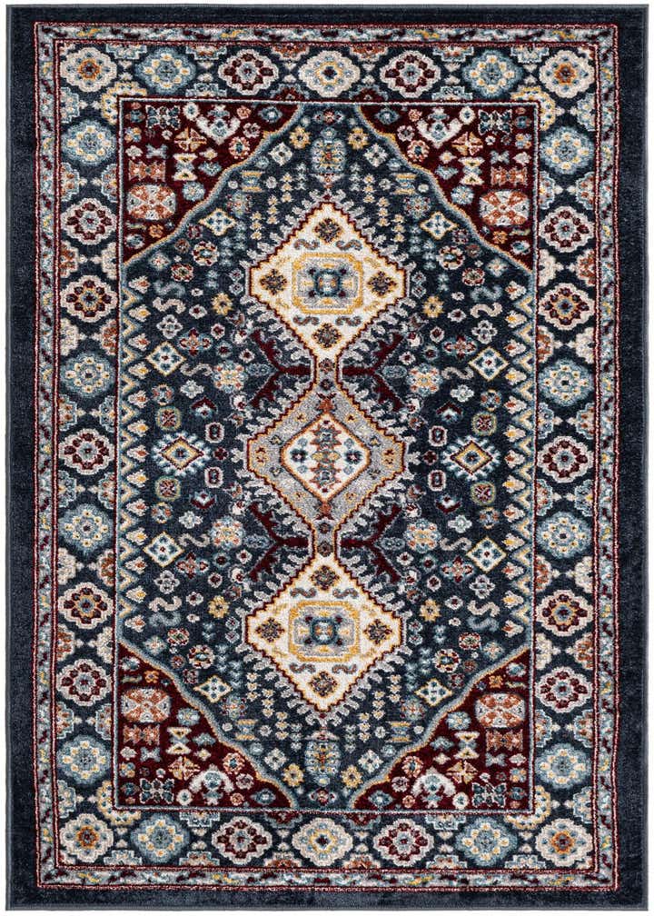 Primary color is Navy Blue. Colors in this rug include: Navy Blue, Gray, Ivory, Red, Yellow.