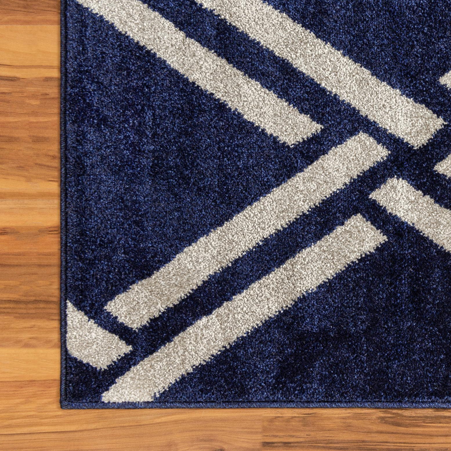 A bold navy blue field sets the stage for a crisp geometric lattice of beige, interlocking bars that form a repeating diamond motif. The pattern is graphic and orderly, with the beige elements sitting slightly raised against the deep navy background to create a subtle tactile contrast. Machine made from 100% polypropylene, the construction delivers a consistent surface and clean edge definition.