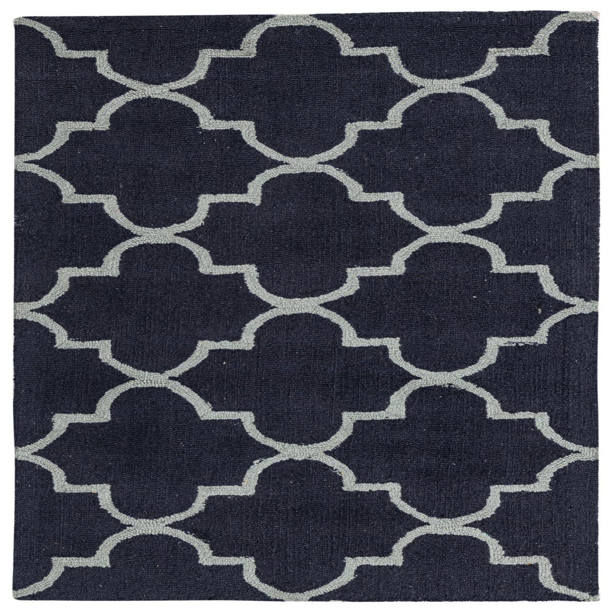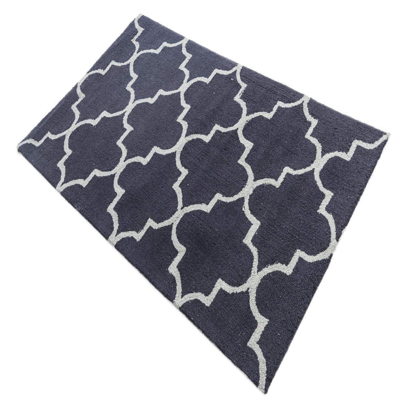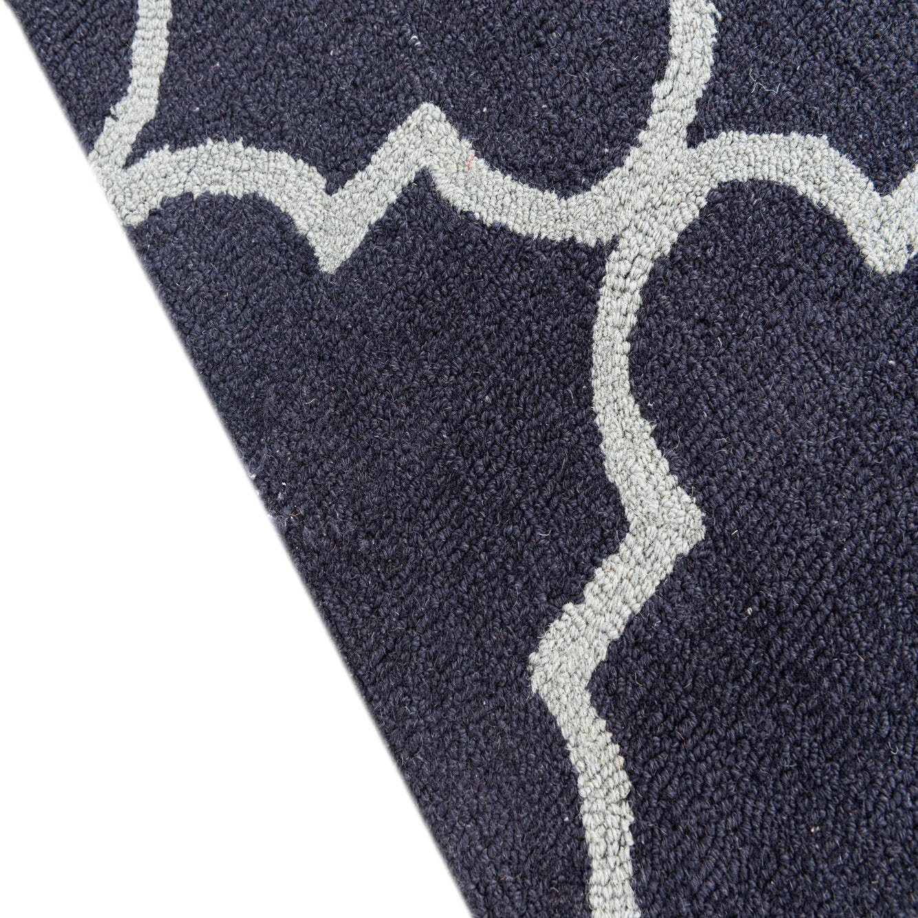 A 3x5 rectangular navy blue modern rug with a high pile and a light gray quatrefoil pattern.