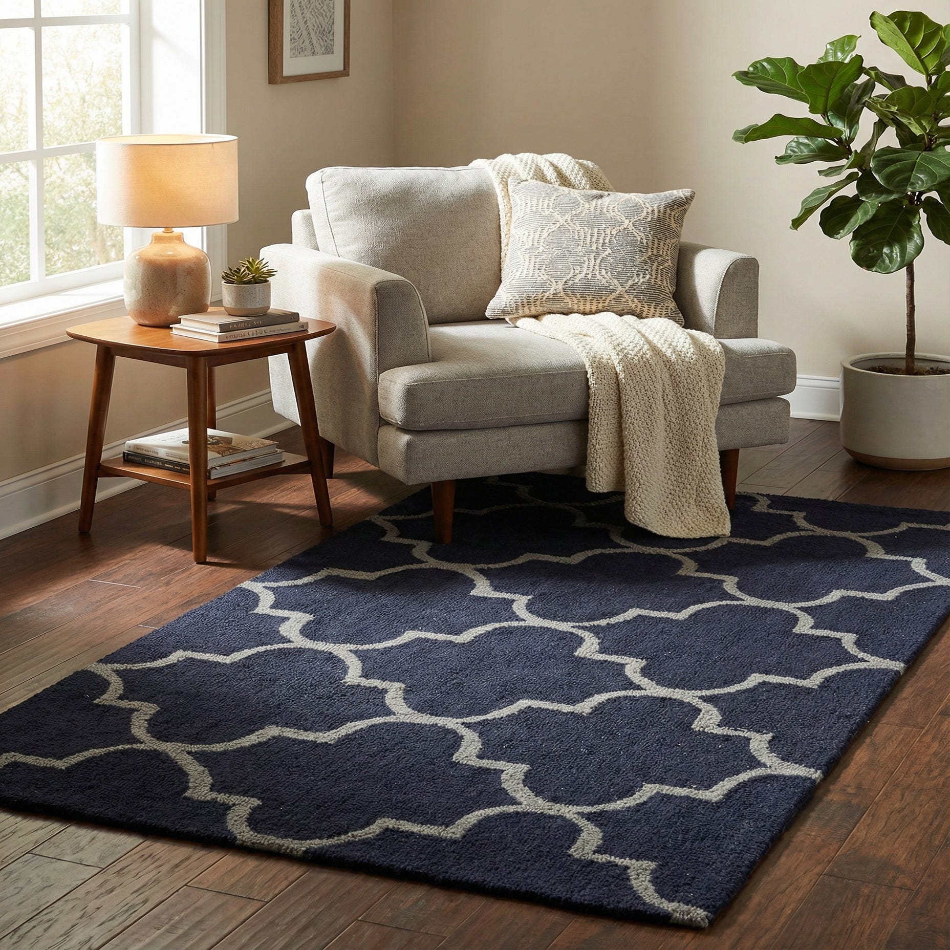 Primary color is Navy Blue. Colors in this rug include: Navy Blue, Gray.
