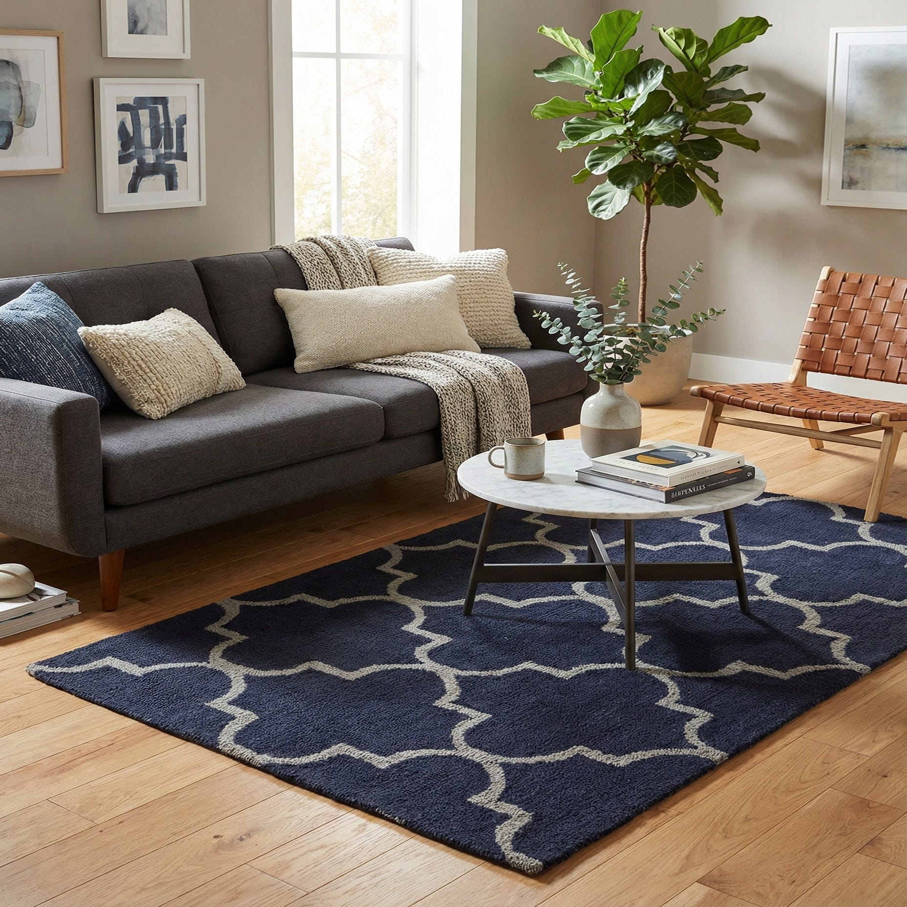 A 3x5 rectangular navy blue rug with a light gray geometric quatrefoil pattern, featuring a high pile.
