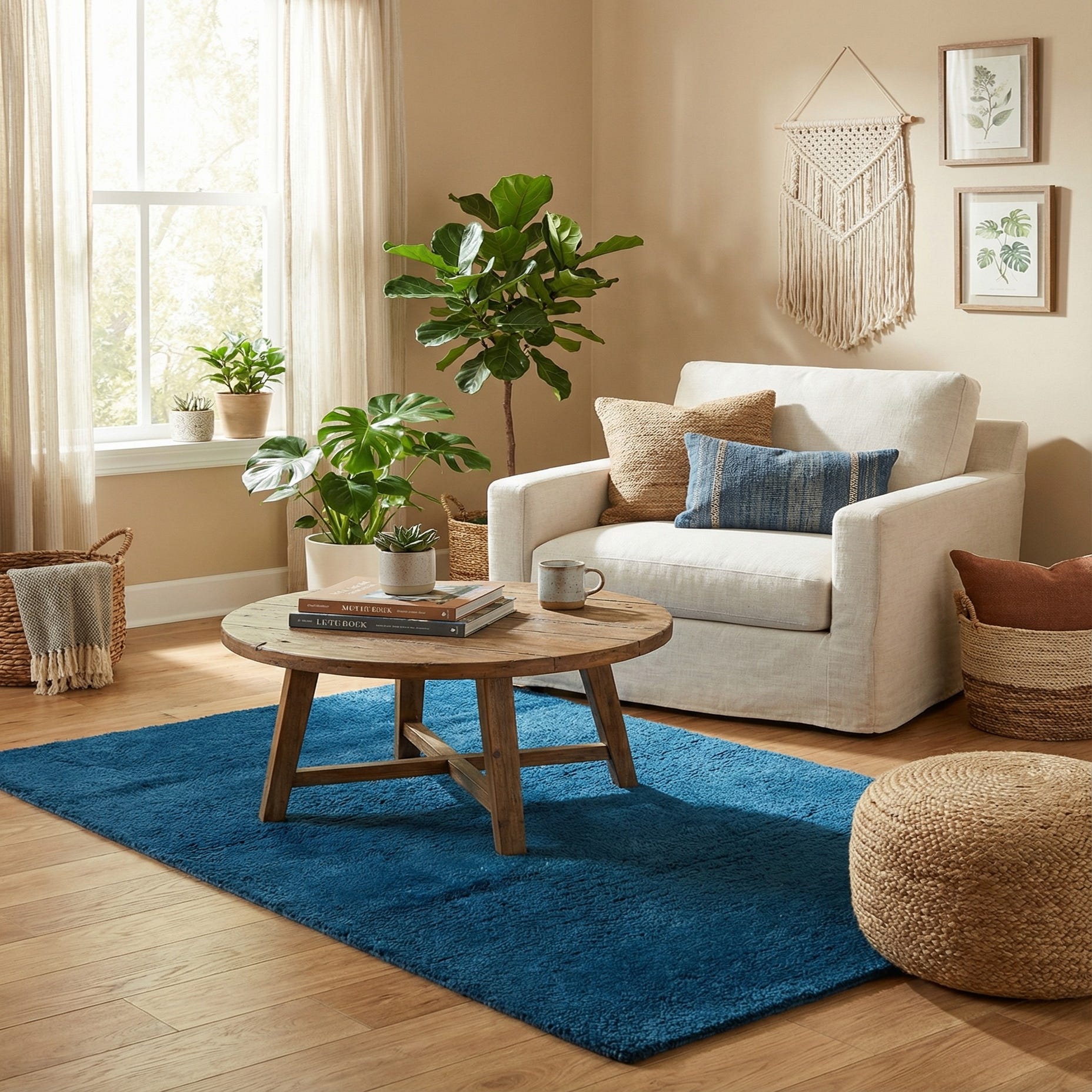 The rich color and simple elegance make it a suitable choice for a variety of interior design themes, from contemporary to traditional settings. Its solid navy blue color can serve as a grounding element in a vividly colored room or as a complementary backdrop in a more subdued or neutral space. This rug could be the focal point in a small sitting area, under a coffee table, or as a welcoming element in an entryway. The woolen texture enhances the feeling of warmth and comfort, making it an excellent addition to areas where a touch of softness is desired.