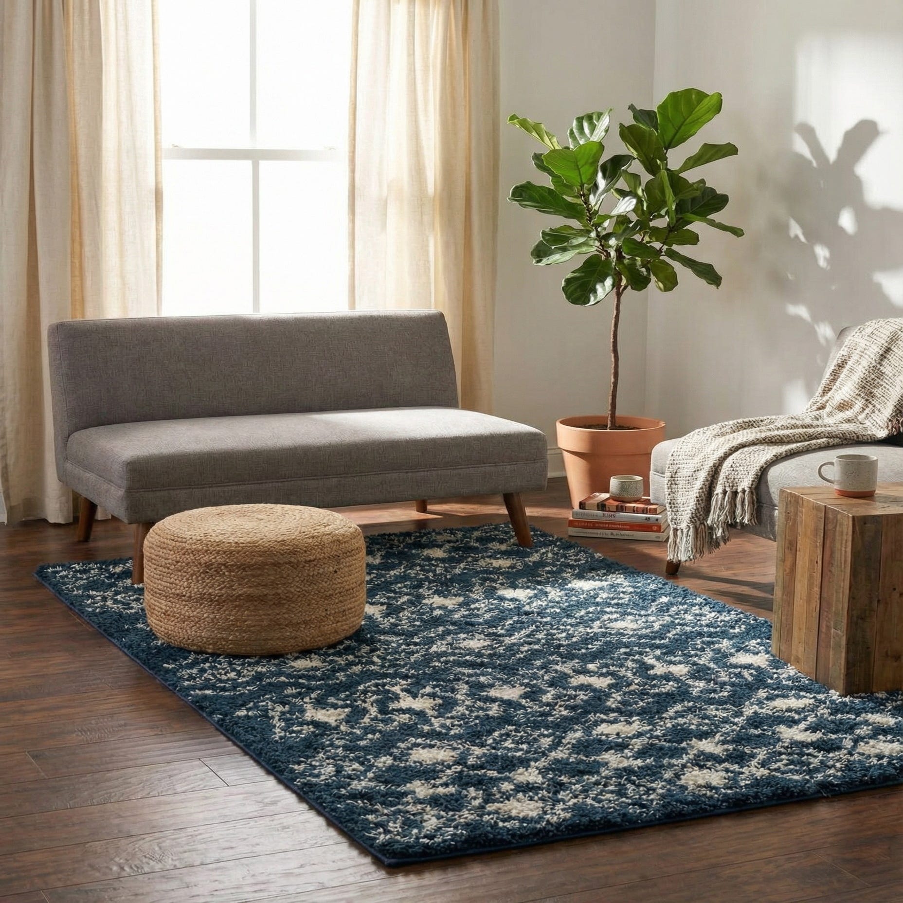 Built with a thick shag pile and machine-made construction in 100% polypropylene, the surface feels plush and springy underfoot, offering a cozy texture that invites bare feet. Its scale and softness make it well suited for anchoring a small seating area, softening a bedside, or adding warmth to a reading nook. Style pairings include coastal or nautical rooms with light woods and crisp linens, transitional living spaces with mixed metal accents, or casual modern interiors where layered textures and deep blues are part of the scheme.