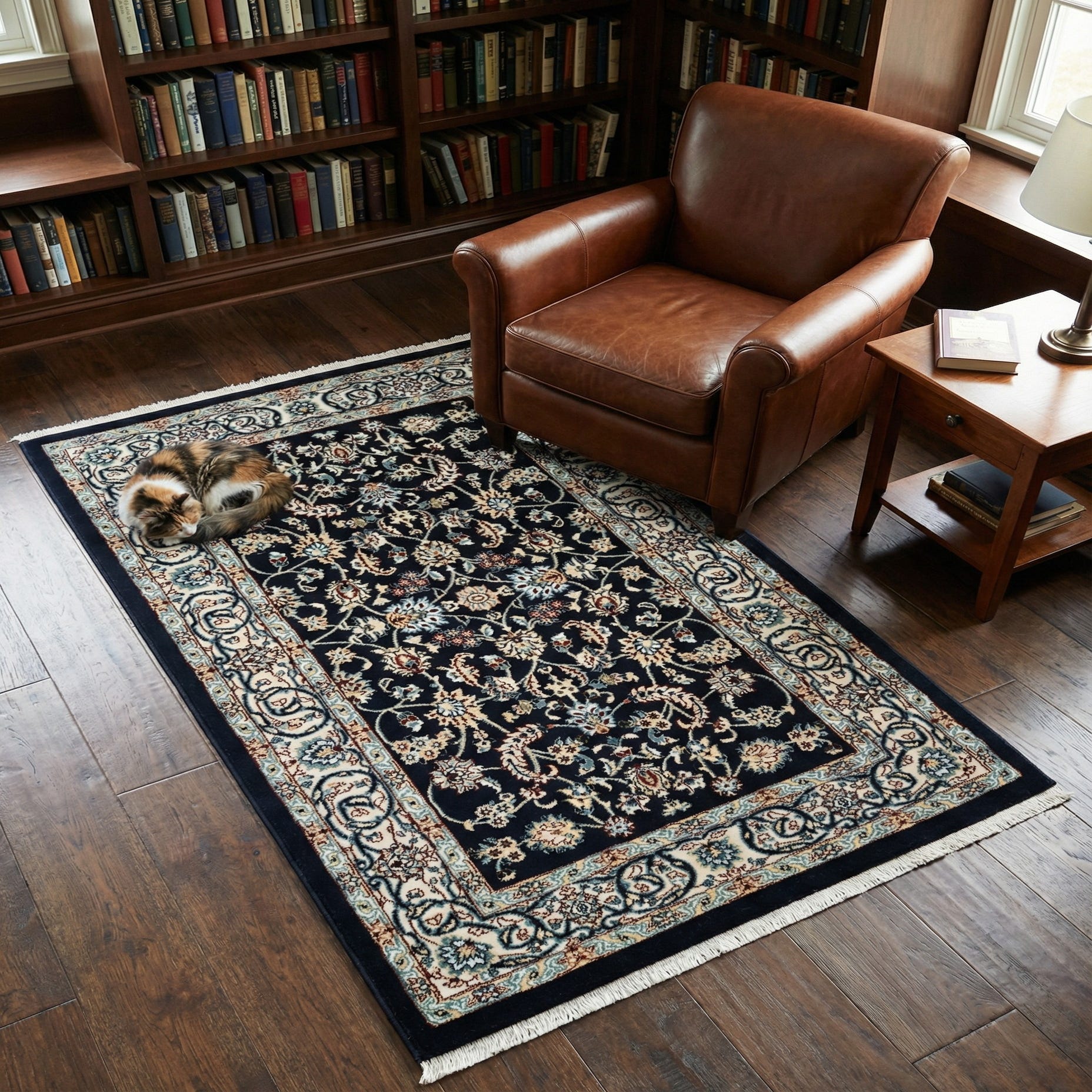 This rug works well as an anchor in a classic living room, tucked into a study, or placed in a foyer to set a welcoming tone. Pair it with warm wood furniture, brass or aged-metal accents and neutral upholstery to let the navy field and multicolored florals stand out, or use it to add traditional character beneath a coffee table for a transitional mix of old and new. It complements hardwood or tile floors and makes a refined accent at the foot of a bed or beside a sofa.
