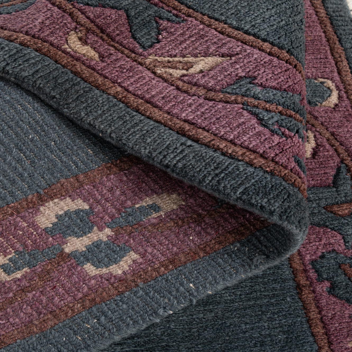 Primary color is Navy Blue. Colors in this rug include: Navy Blue, Brown, Ivory, Purple.