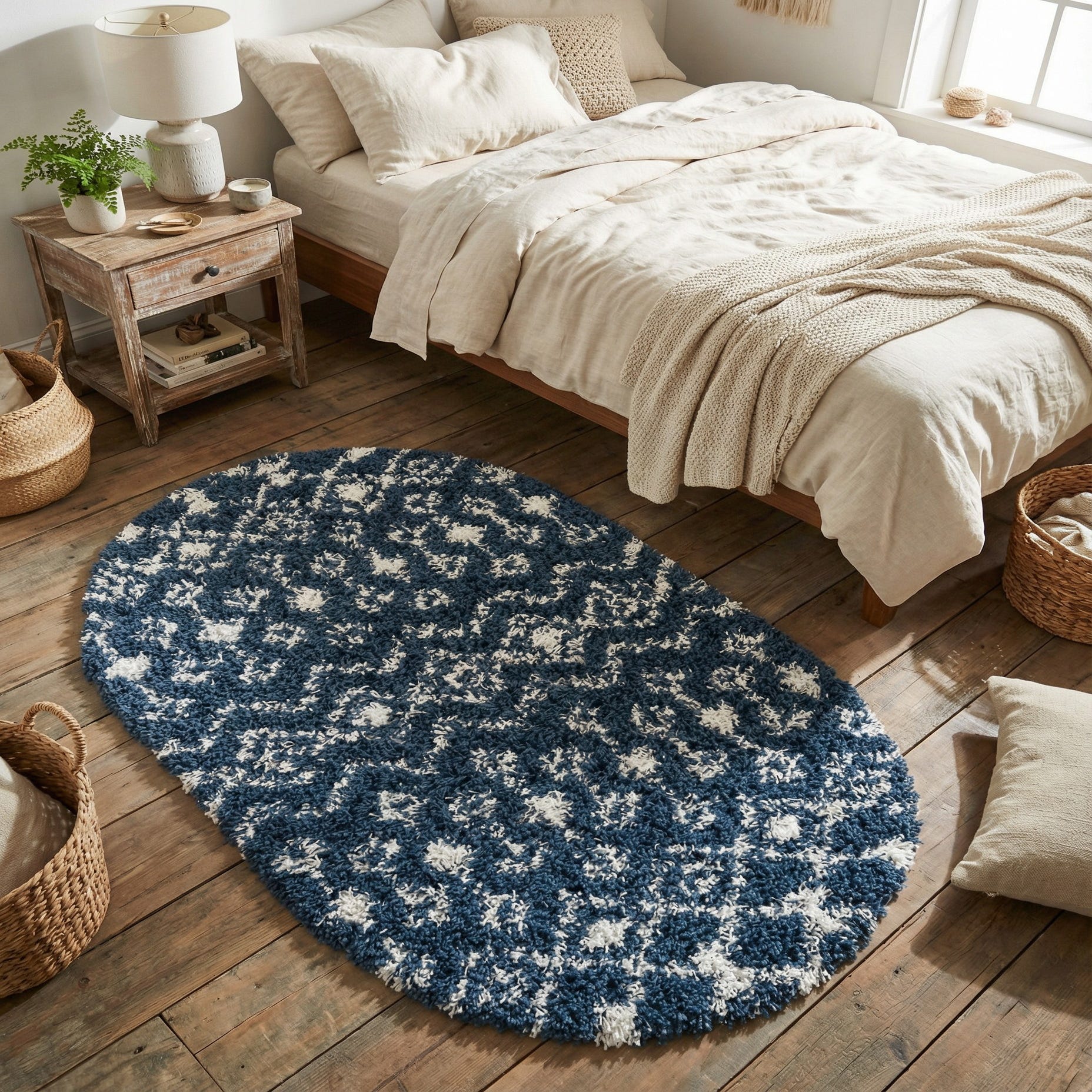The Moroccan Trellis Shag collection presents a sophisticated 3x5 oval rug, machine woven with 100% polypropylene to ensure durability and ease of maintenance. With a navy blue background harmoniously contrasted by ivory accents, the rug showcases a timeless trellis pattern that brings a touch of elegance to any space. The shag texture adds a tactile dimension, inviting comfort underfoot and a cozy ambiance.