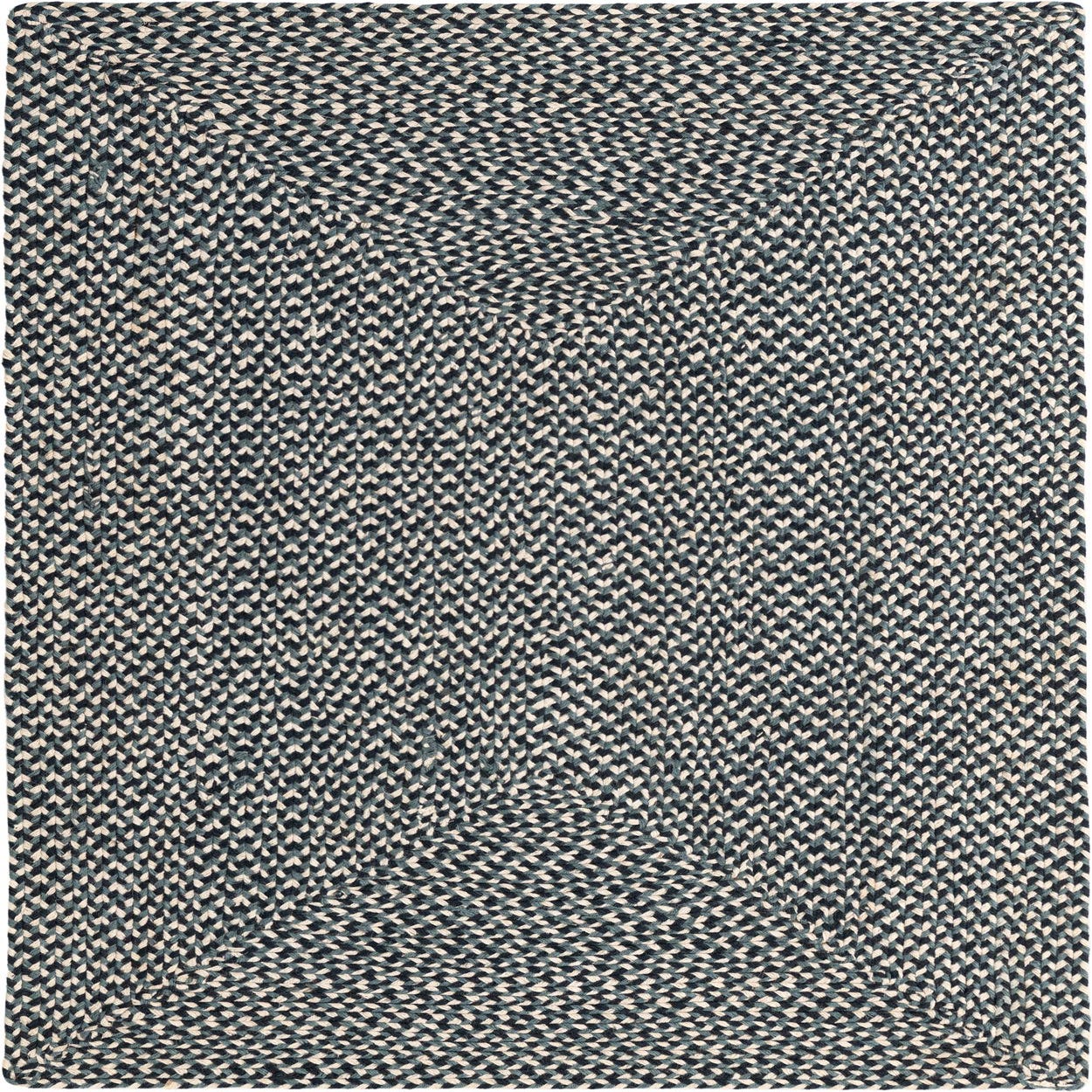 Hand-braided from 100% jute, this braided rug combines navy blue, ivory and gray strands on a navy background to form a tight, tweed-like weave. The hand-braided construction creates concentric rectangular banding that gives the surface a defined, structured look. Running your hand across it, you feel the natural tooth of jute and the subtle give of braided fibers—low-profile and textured rather than plush—so the pattern reads clearly while adding tactile warmth underfoot.