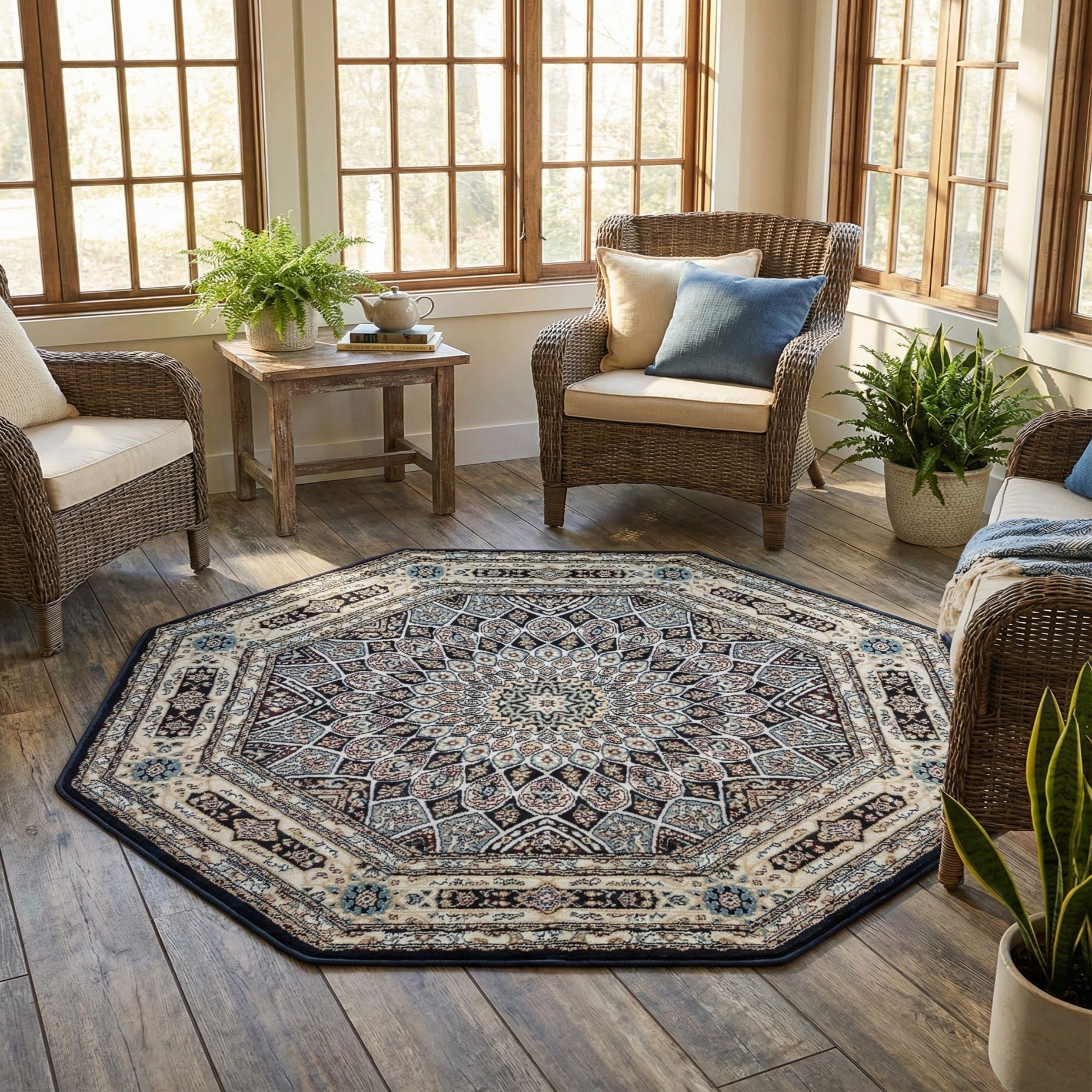 An octagon-shaped rug with a central medallion in navy blue, cream, and light blue, featuring intricate traditional Oriental patterns.