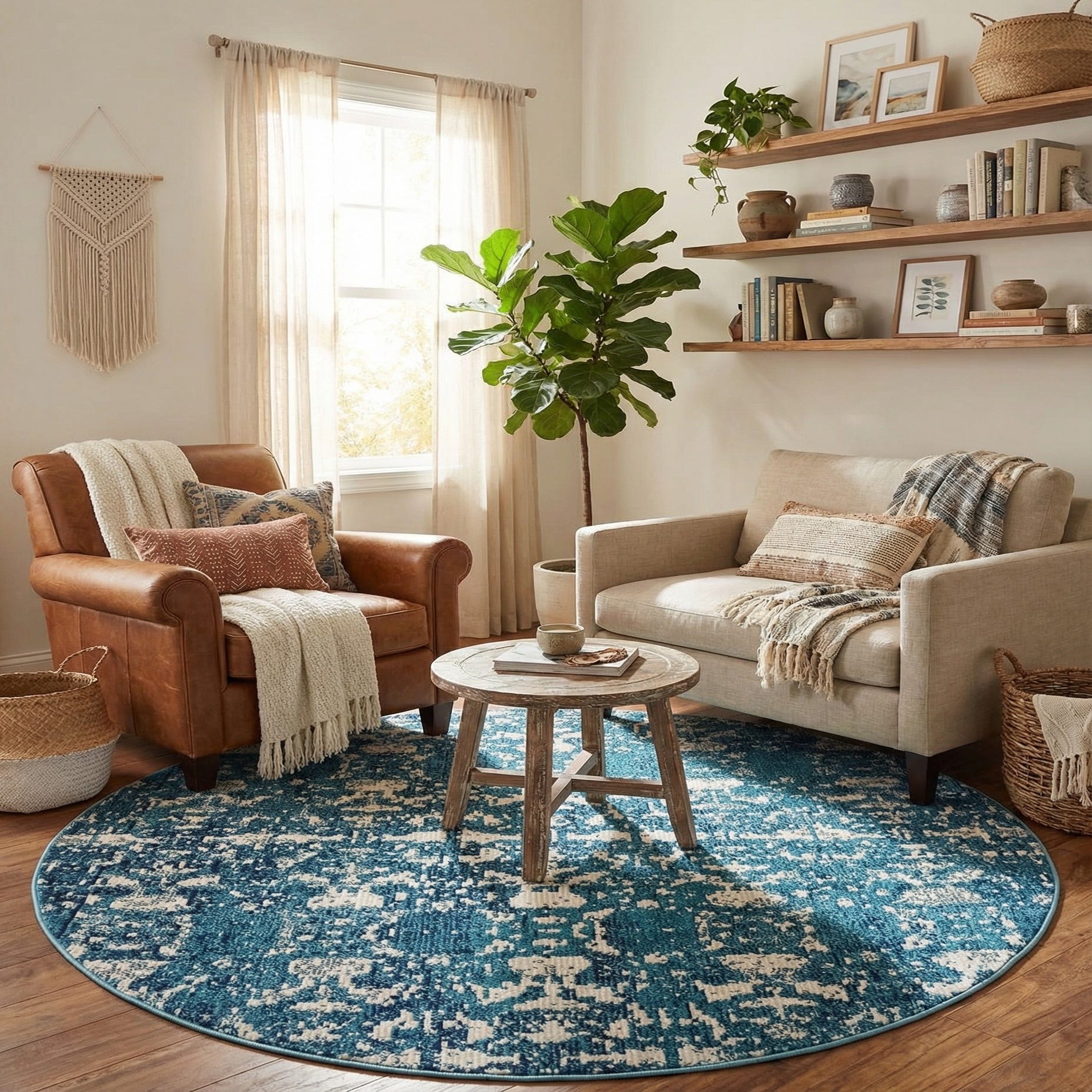A 4' round Amulet rug from Rugs.com features a distressed Bohemian medallion pattern in varying shades of blue and white.