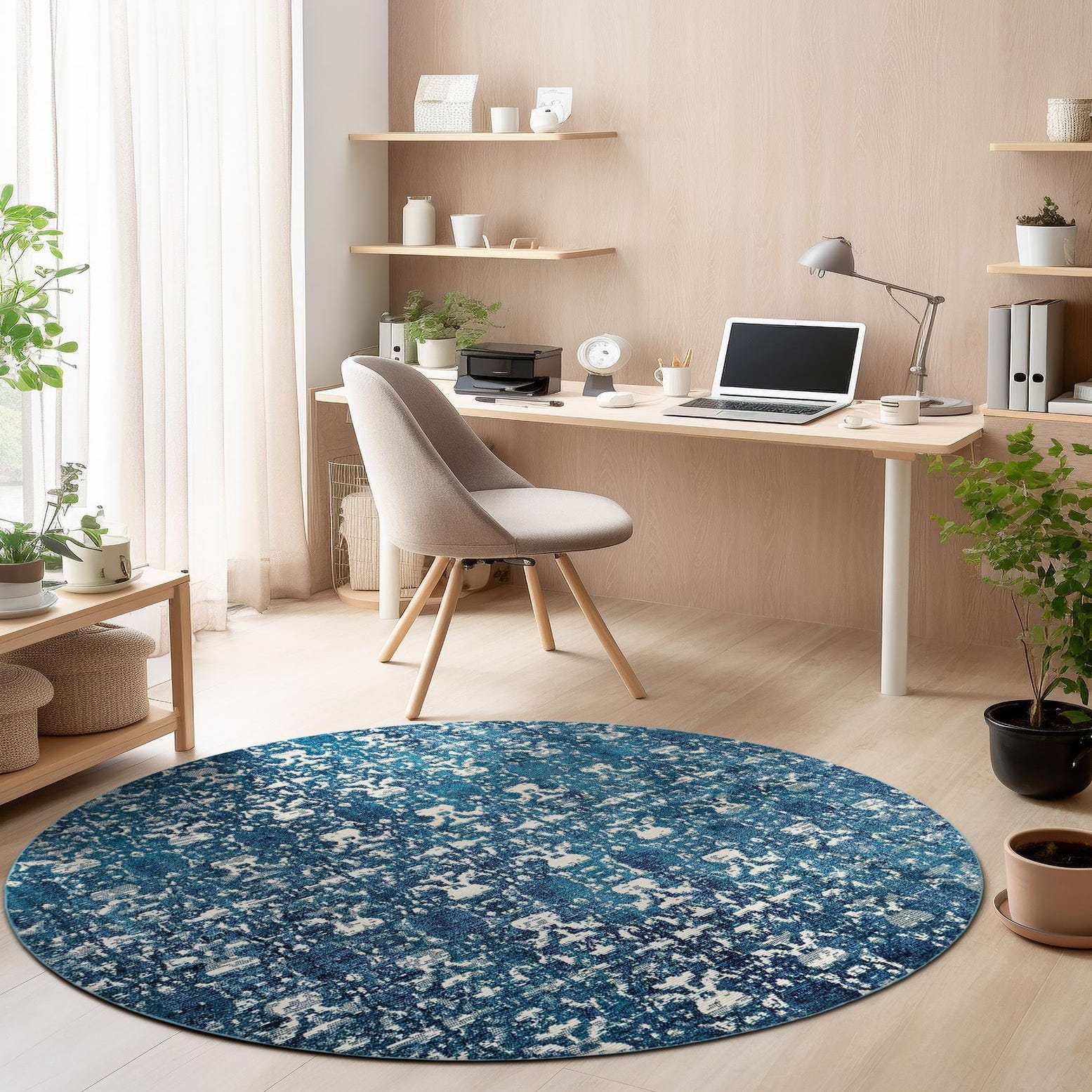 This round rug presents an abstract, distressed pattern that layers organic motifs in teal and ivory over a deep navy-blue ground, with soft touches of beige adding warmth. Machine made from 100% polypropylene, the surface feels smooth with a subtle, low-pile texture that’s both comfortable underfoot and visually rich — the mix of color saturation and worn-in detailing gives the rug depth without heavy ornamentation.