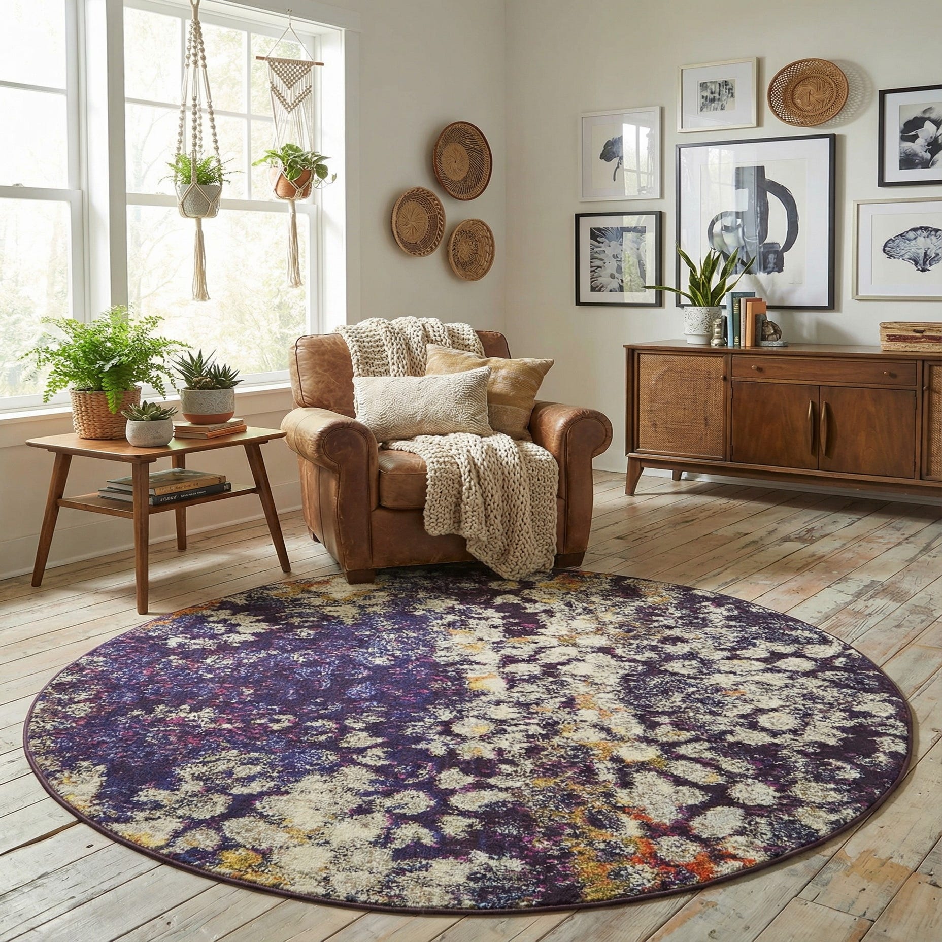 A 4' round abstract rug featuring a blend of deep blues, purples, and hints of orange and cream, creating a mottled, artistic pattern.