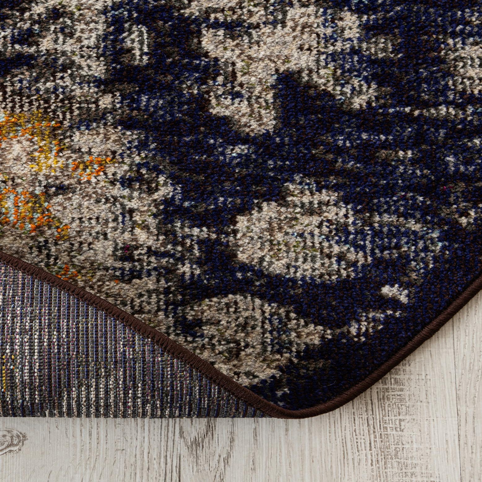 A dense, machine-made construction in 100% polypropylene gives this round rug a soft, slightly plush surface with a low-profile pile you can feel underfoot. The pattern is an abstract, painterly blend of floral-like medallion fragments and distressed washes that rise from a deep navy background. Ivory clusters create striking contrast while accents of black, blue, brown, orange, pink, and yellow punctuate the field like brushstrokes, producing a layered, artful effect that reads both modern and timeworn.