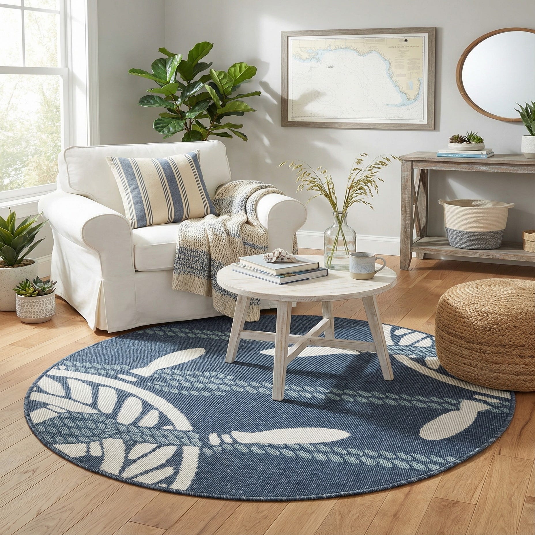 A 4' round navy blue indoor/outdoor rug with a modern coastal pattern featuring white anchors and light blue rope designs.