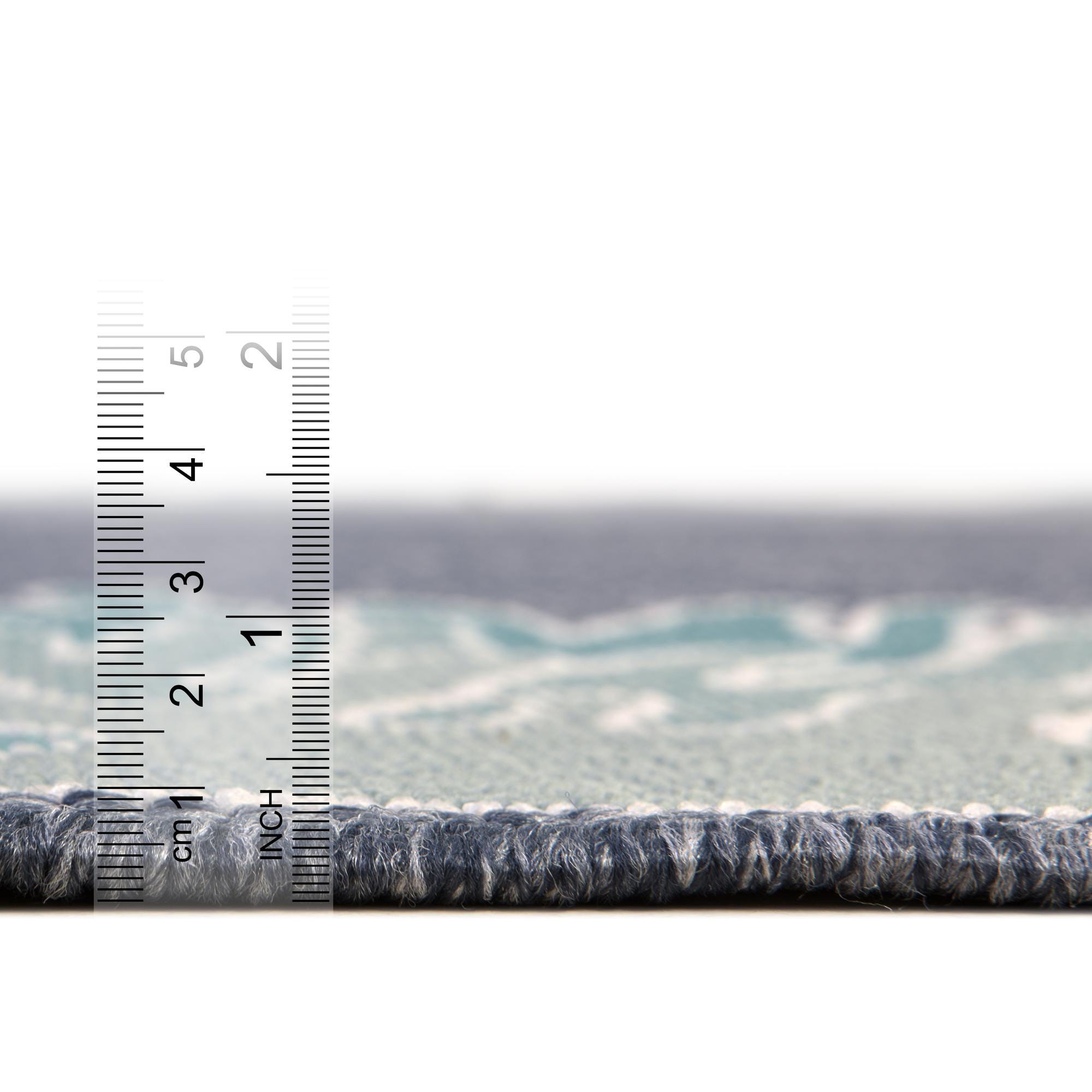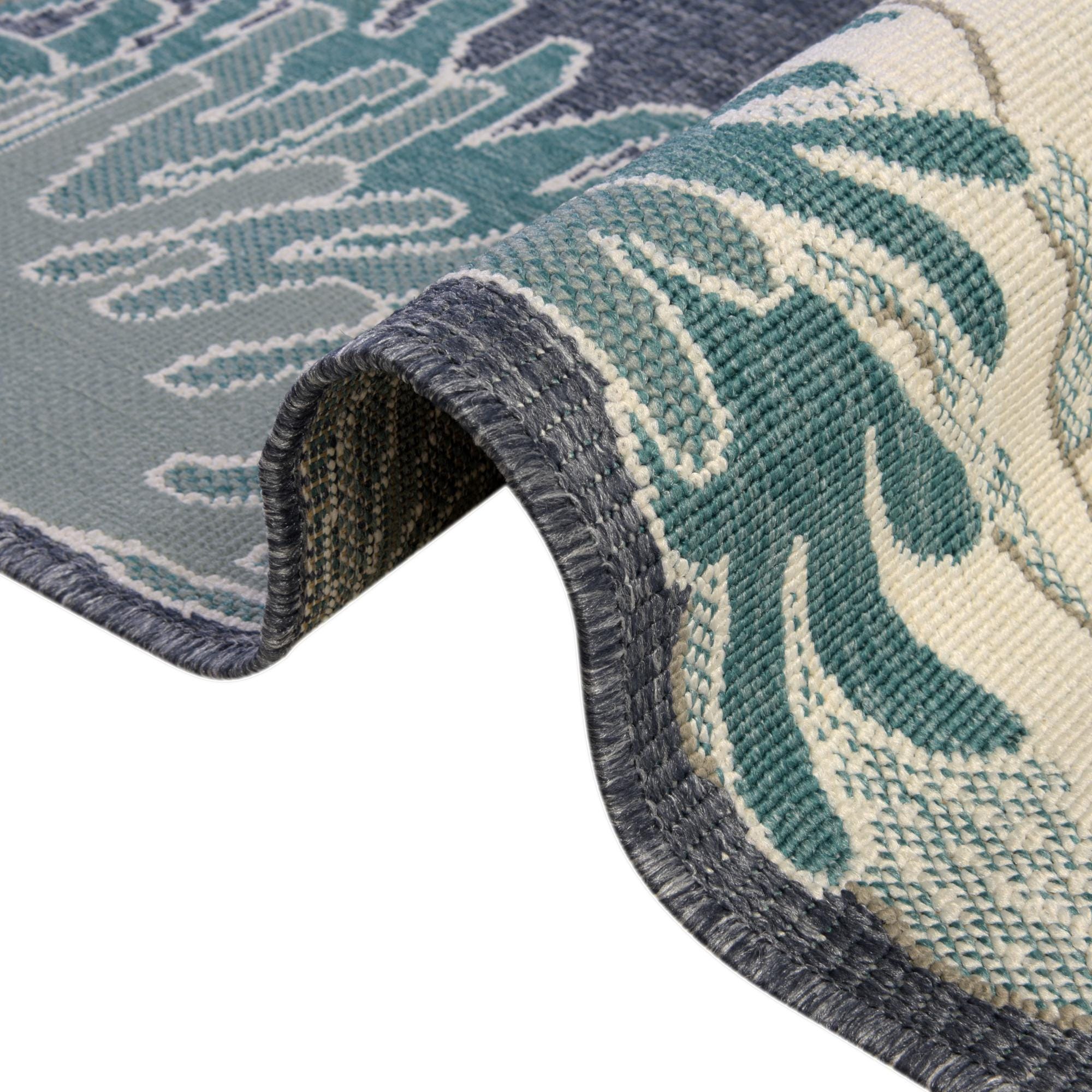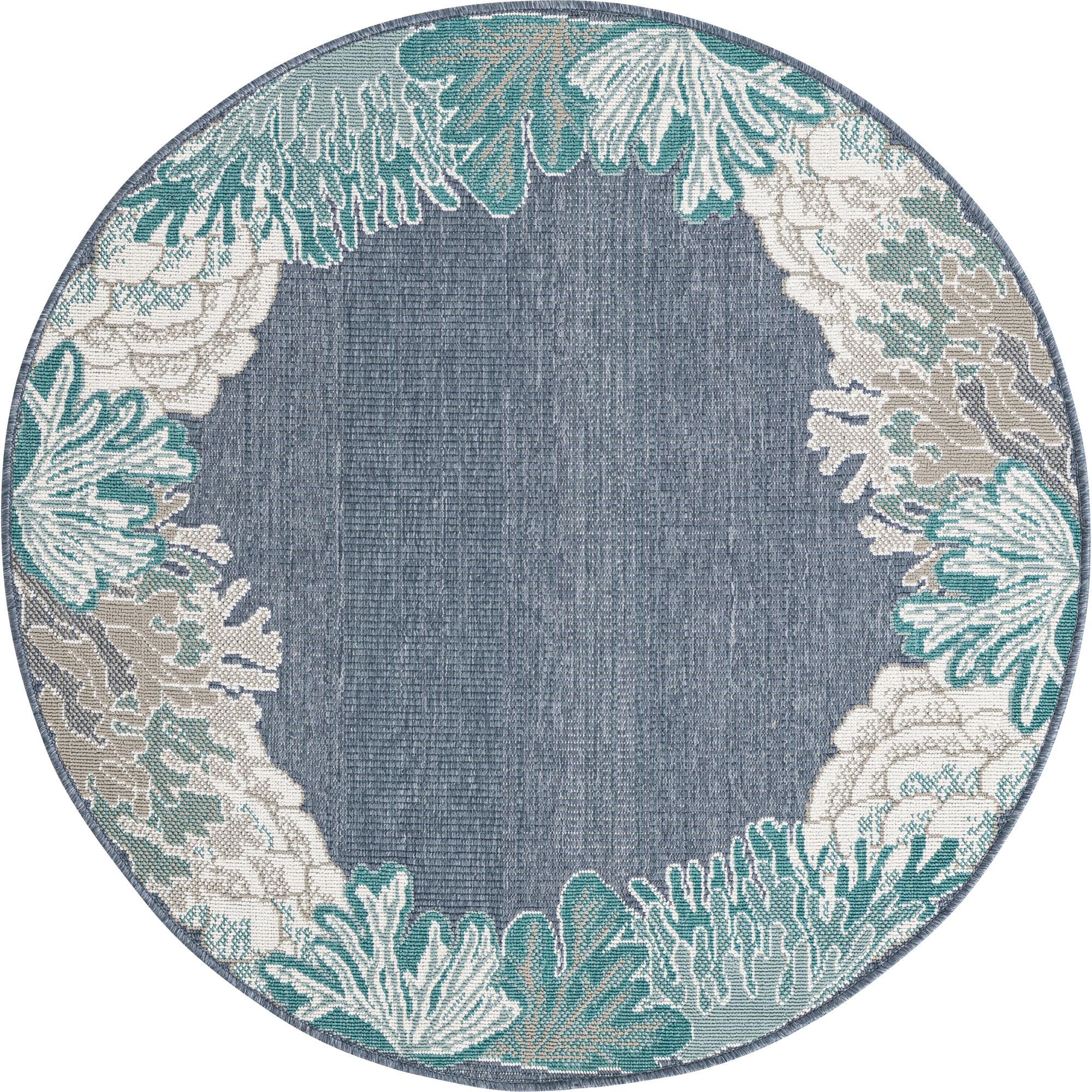 A deep navy blue field anchors this round rug, bordered by a wreath of stylized coral and seaweed motifs in blue, ivory and green. The pattern balances open space and decorative detail, letting the marine-inspired shapes frame the center without overcrowding it. Machine made from 100% polypropylene, the rug has a low-profile, tightly woven surface with a slightly ribbed texture that feels firm underfoot and shows the pattern with clear, crisp definition.
