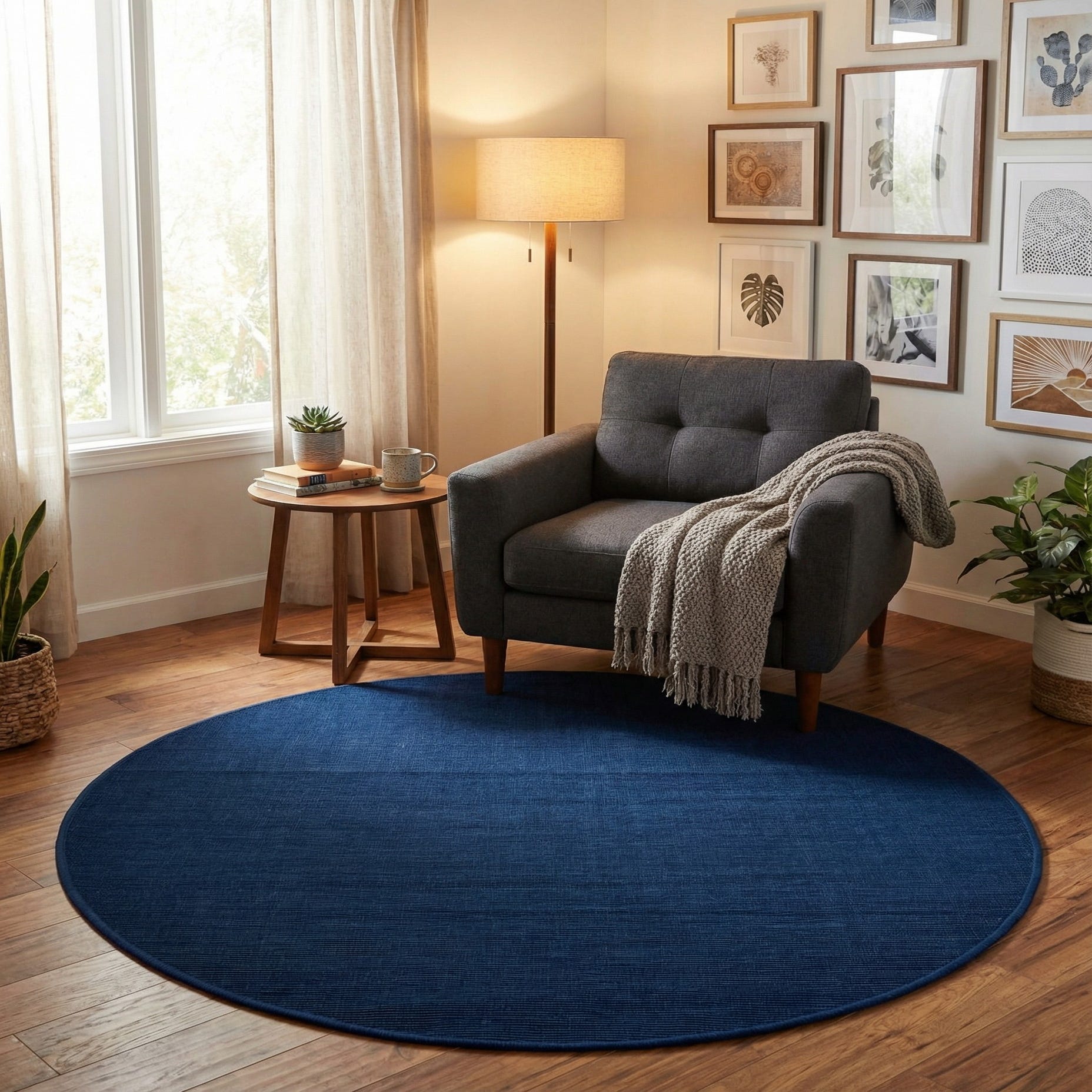 Use this round rug to anchor small seating areas, a bistro or round dining table, or an entry with a bench. Its rich navy pairs well with light woods and white or gray upholstery, and it complements both coastal and contemporary schemes as well as mid?century or transitional decor. Add brass or matte black accents and patterned throw pillows for contrast, or keep surrounding finishes neutral for a calm, layered look.