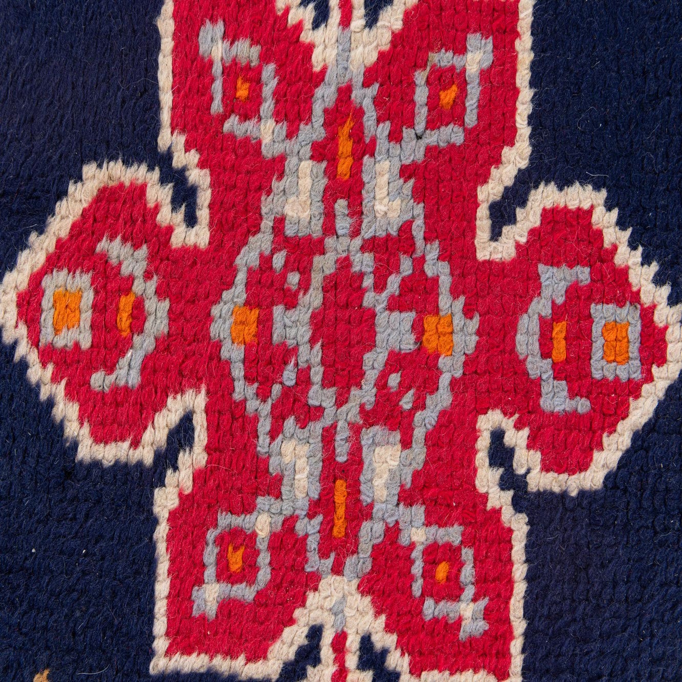 Primary color is Navy Blue. Colors in this rug include: Navy Blue, Ivory, Orange, Yellow, Light Blue, Light Brown, Red.