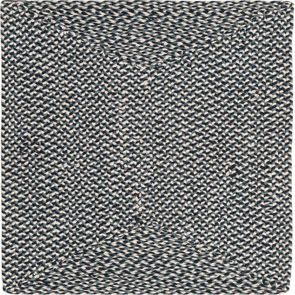 A 4 ft runner rug in a braided jute texture, featuring a modern pattern of navy blue, light blue, and cream.