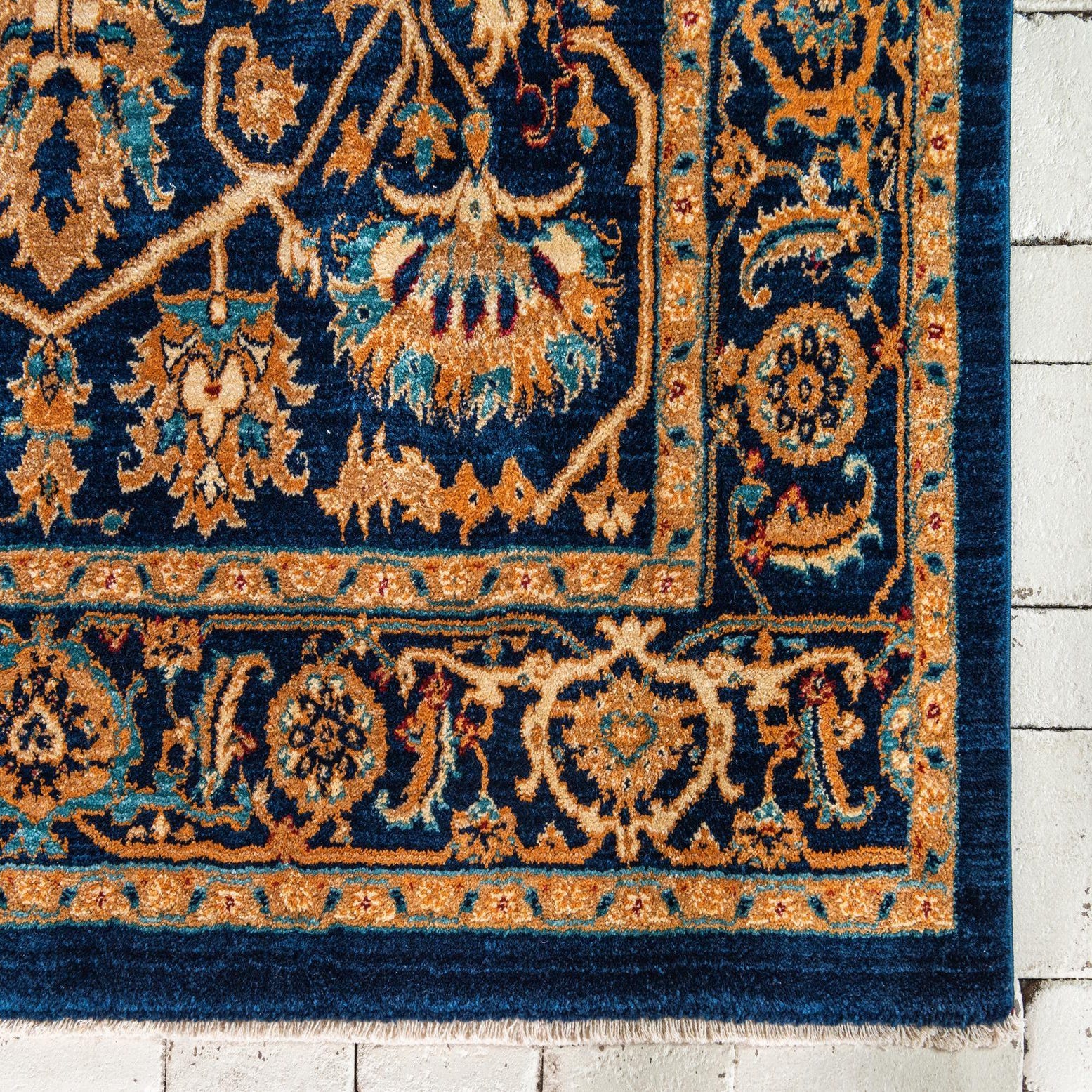 Primary color is Navy Blue. Colors in this rug include: Navy Blue, Beige, Brown, Cream, Light Blue, Orange.
