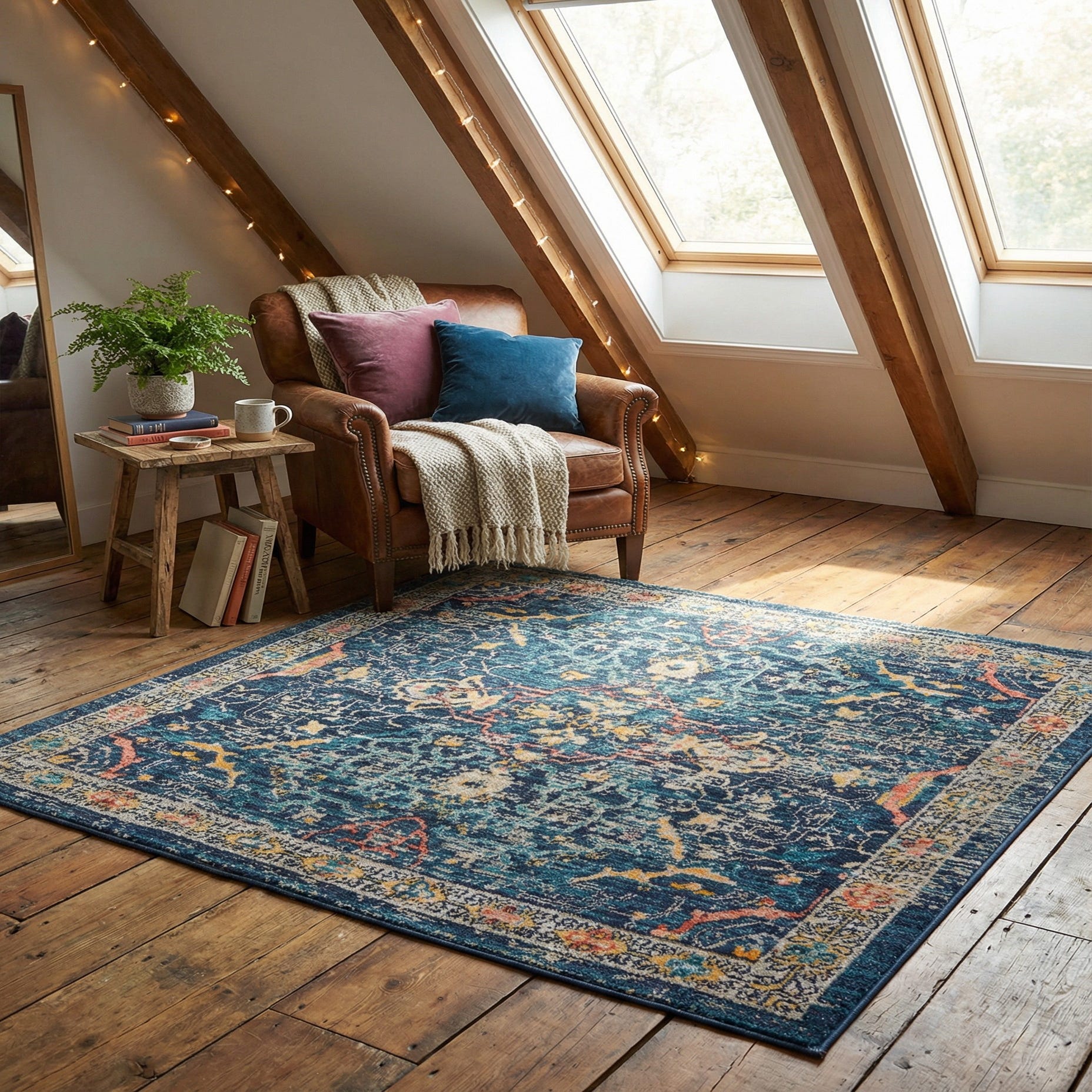 This piece fits well in a range of interiors: place it beneath a compact coffee table to anchor a small living room, layer it in a reading nook with warm wood furniture and brass accents, or use it in an entryway to introduce color and pattern. Its navy background pairs easily with neutral sofas and linen textiles, while the pops of orange and yellow liven transitional or eclectic schemes.