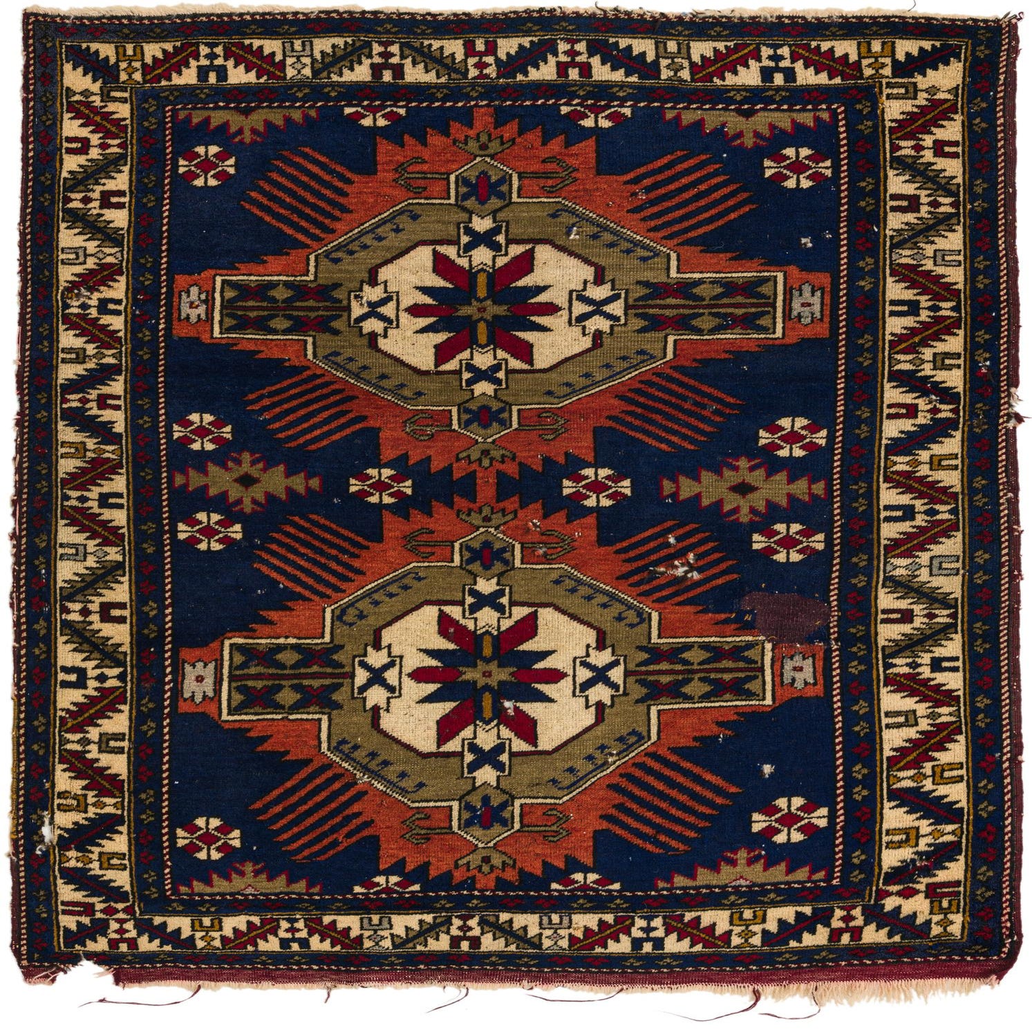The rug's authentic, traditional style is accentuated by its antique character indicated by a low pile, areas of repair, small spot damage, and missing fringe, contributing to its storied appearance and charm. Fringe detail on the edge adds a classic finish to the rug's aesthetic.