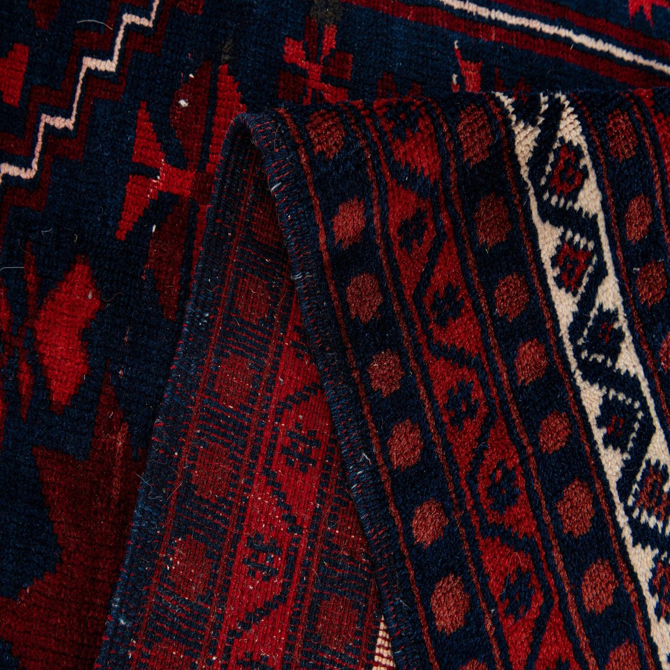 Primary color is Navy Blue. Colors in this rug include: Navy Blue, Red, Ivory.