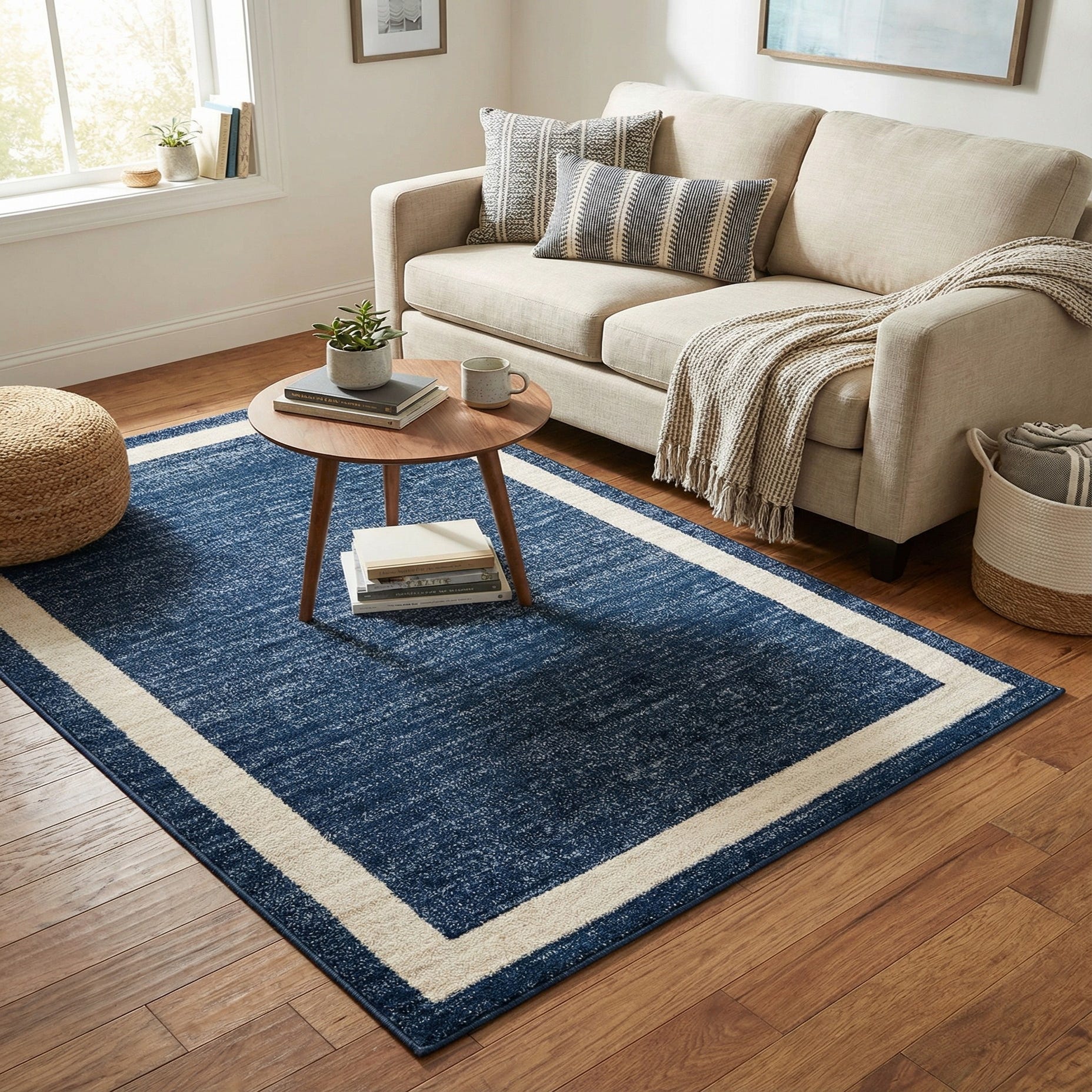 A 4x6 rectangular navy blue area rug with a clean, solid border in a cream color, ideal for a living room.