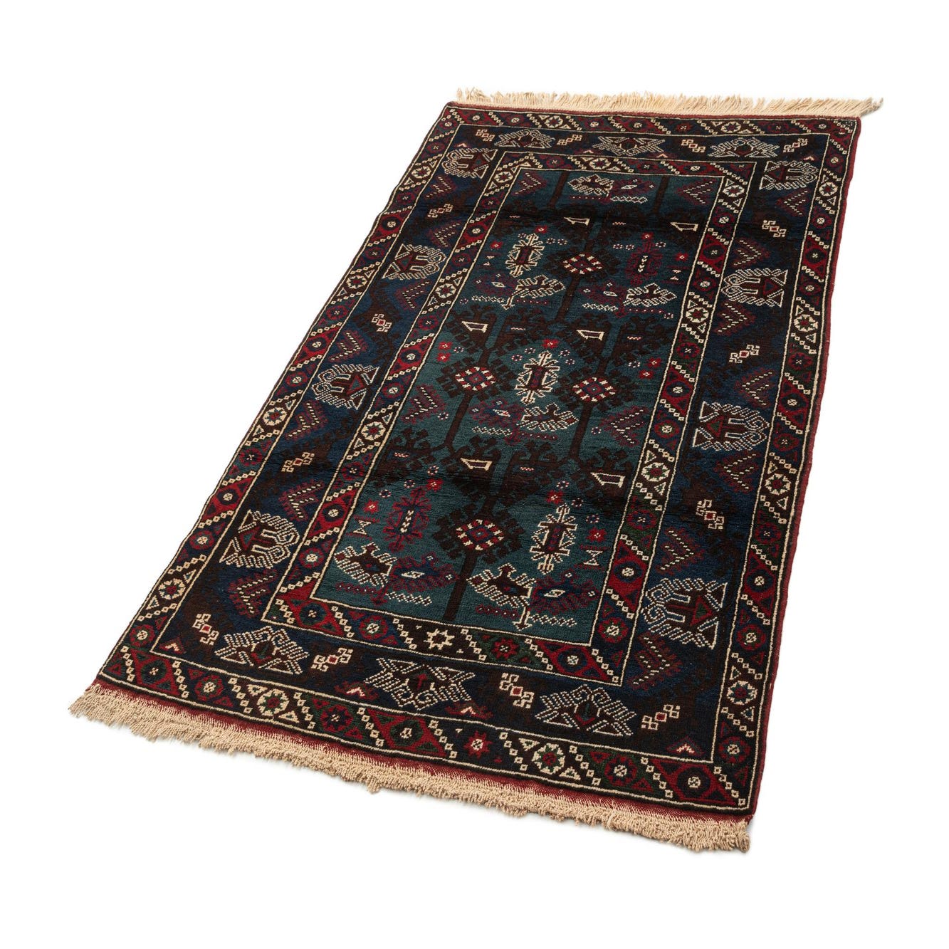 A 4x6 rectangular Balouch rug with a tribal pattern in deep blues, red, and cream, featuring intricate geometric motifs and fringed ends.