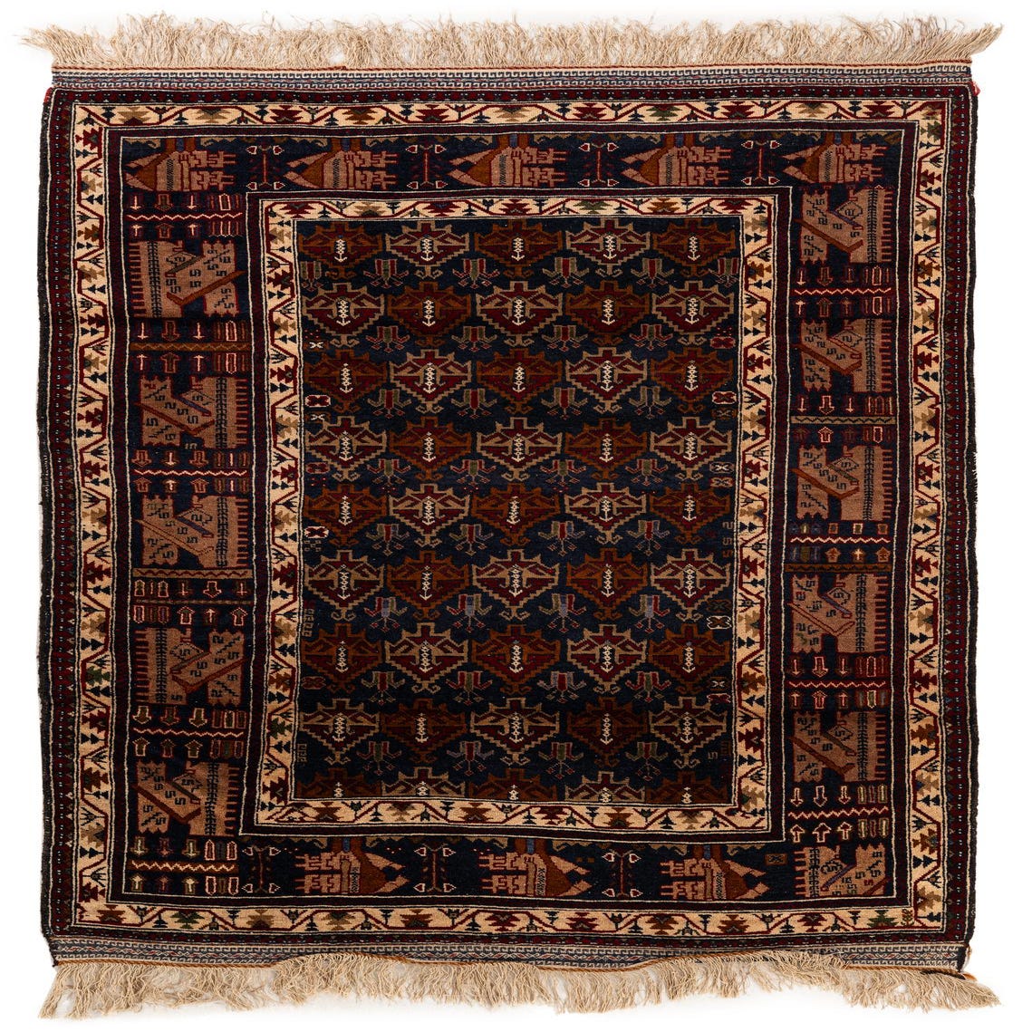 A 4x6 rectangular Balouch rug with a traditional Persian tribal pattern in deep blues, rich browns, and cream accents, featuring intricate geometric motifs and a fringed edge.