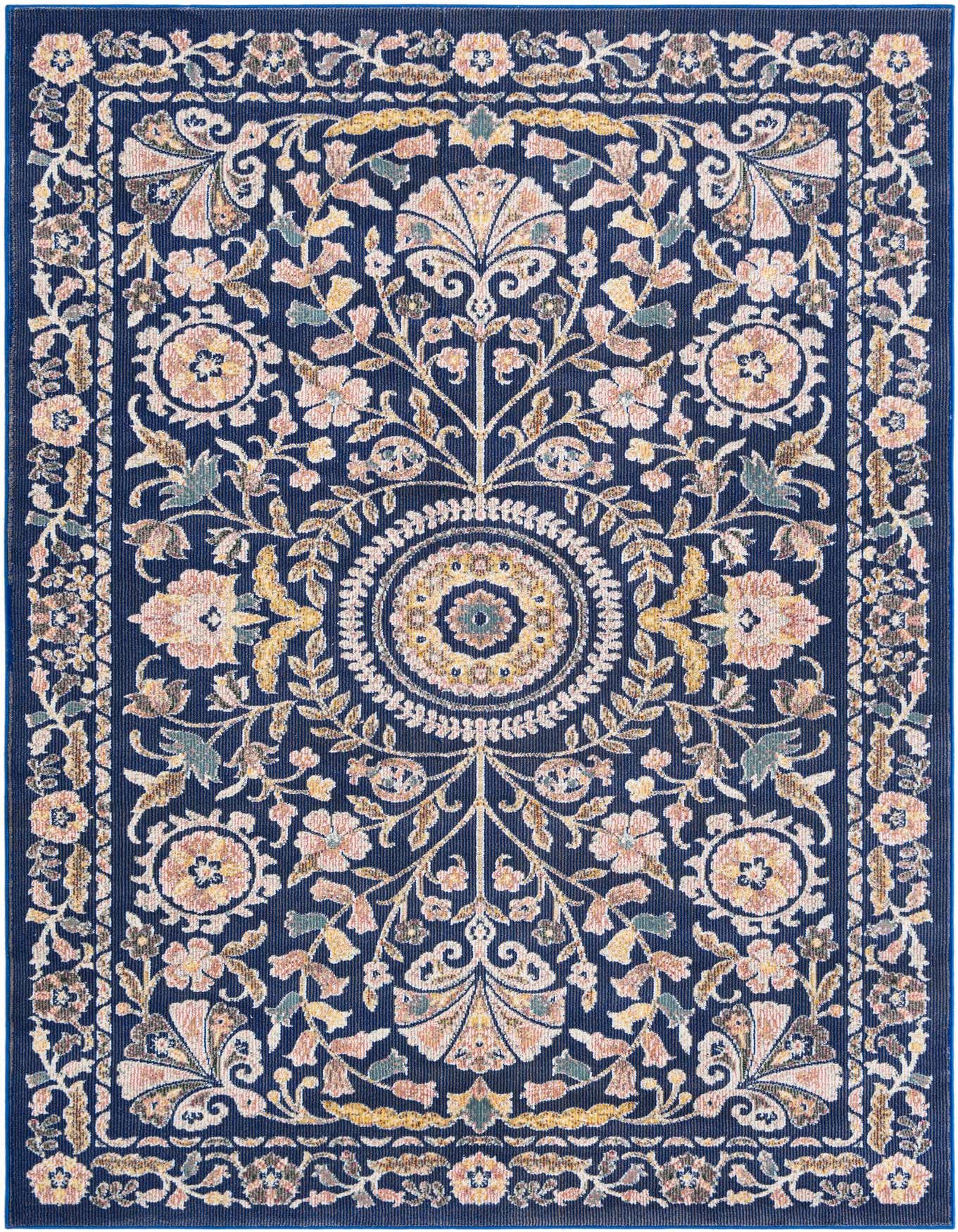 Primary color is Navy Blue. Colors in this rug include: Navy Blue, Ivory, Yellow, Pink, Green.