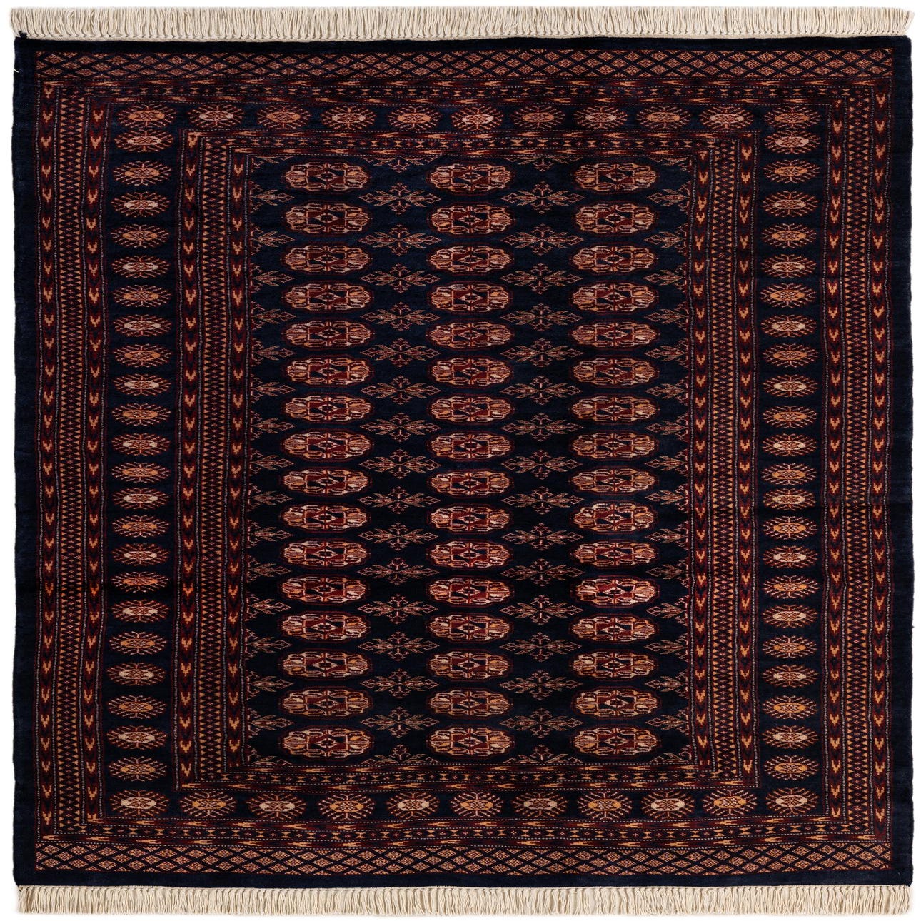 Primary color is Navy Blue. Colors in this rug include: Navy Blue, Brown, Ivory, Red, Orange.