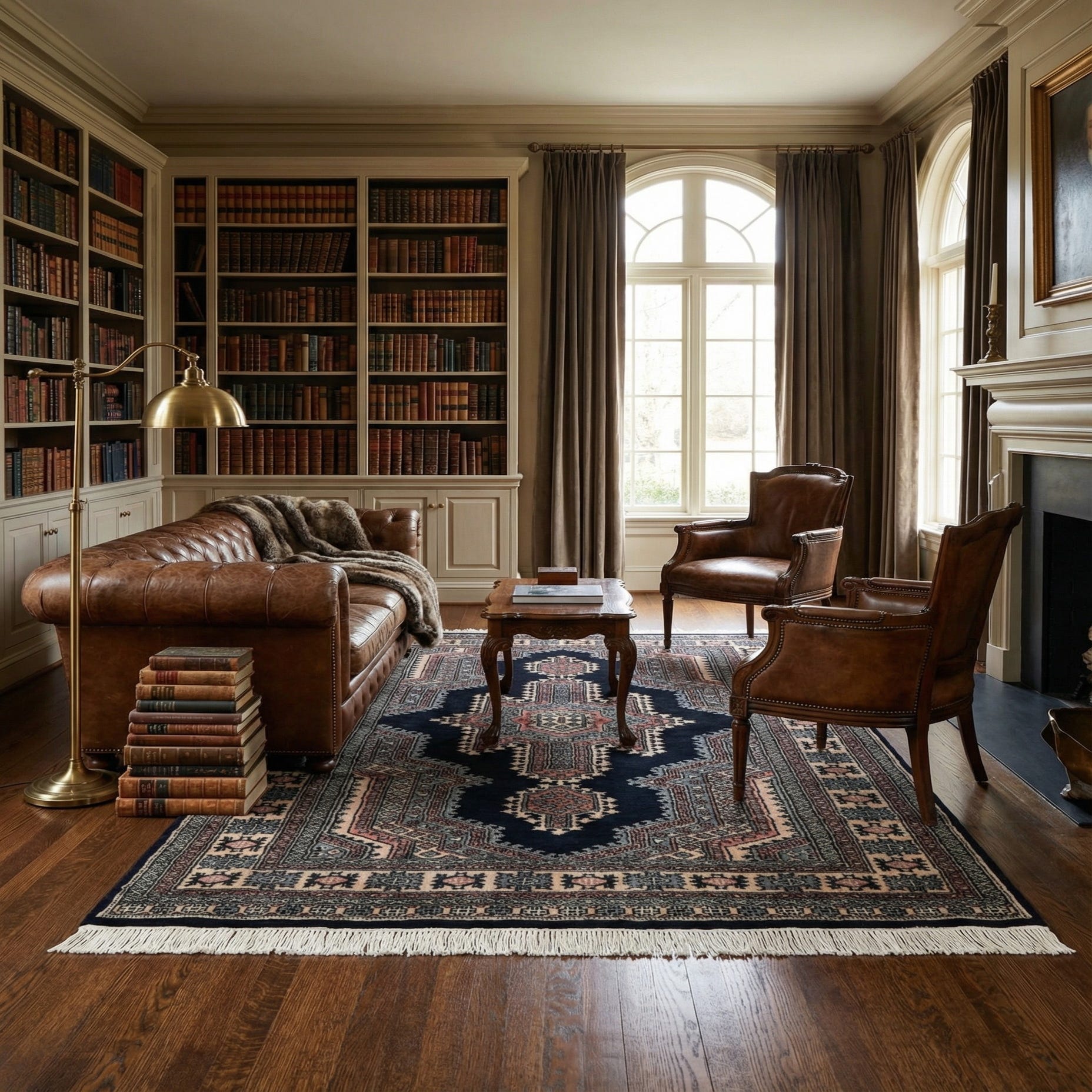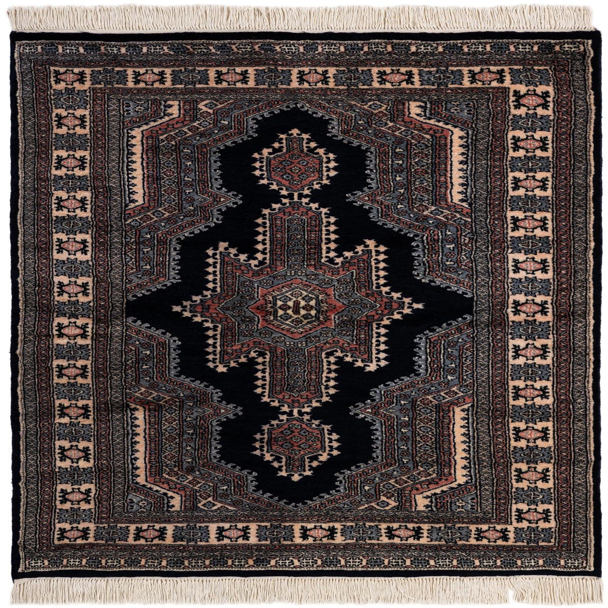 A 4x6 rectangular Bokhara rug with a central medallion and intricate tribal patterns in blues, reds, and creams on a dark background, with fringe.