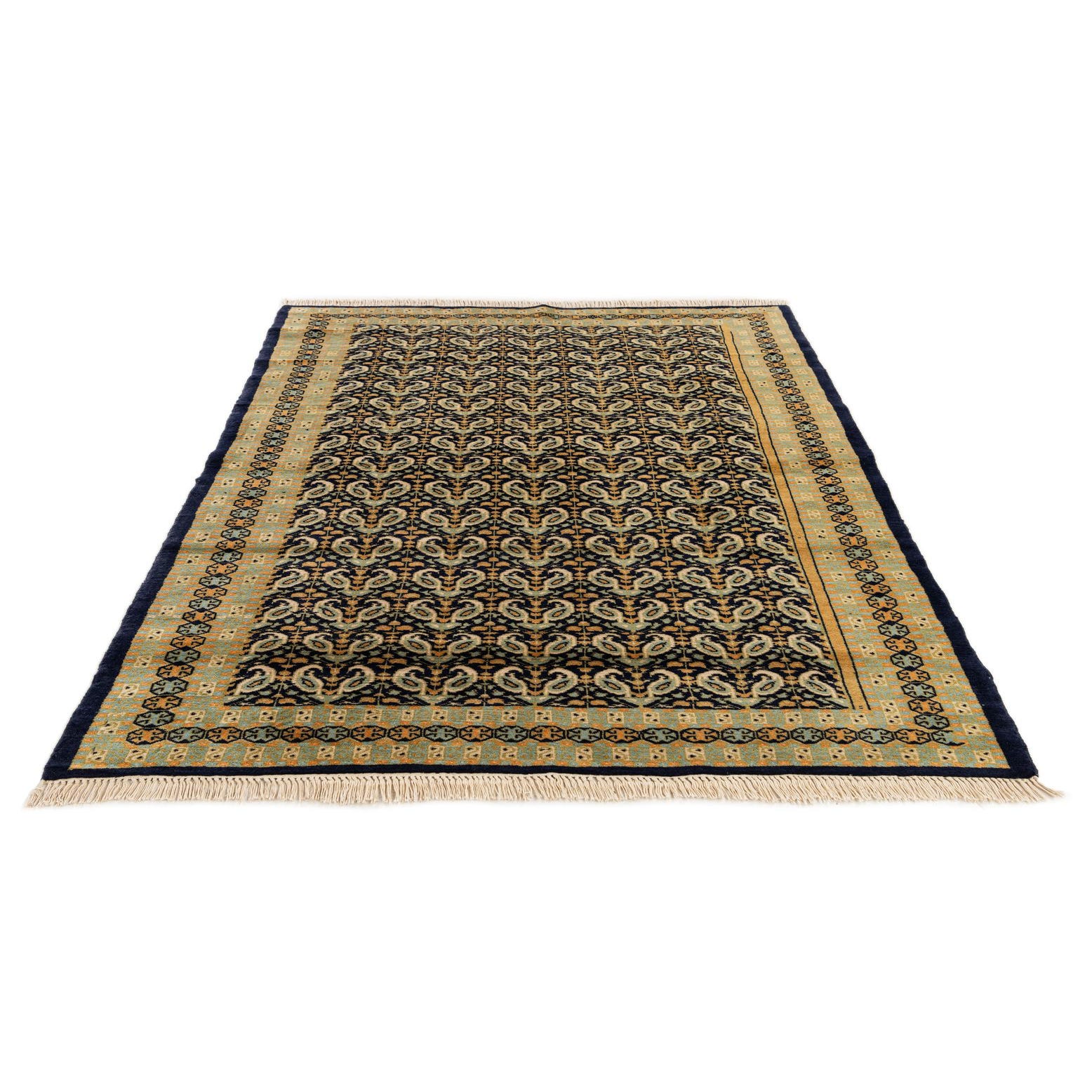 A 4x6 rectangular Bokhara rug featuring a dense navy blue field with light blue and gold tribal paisley motifs, bordered by a light blue and gold pattern, with fringe.
