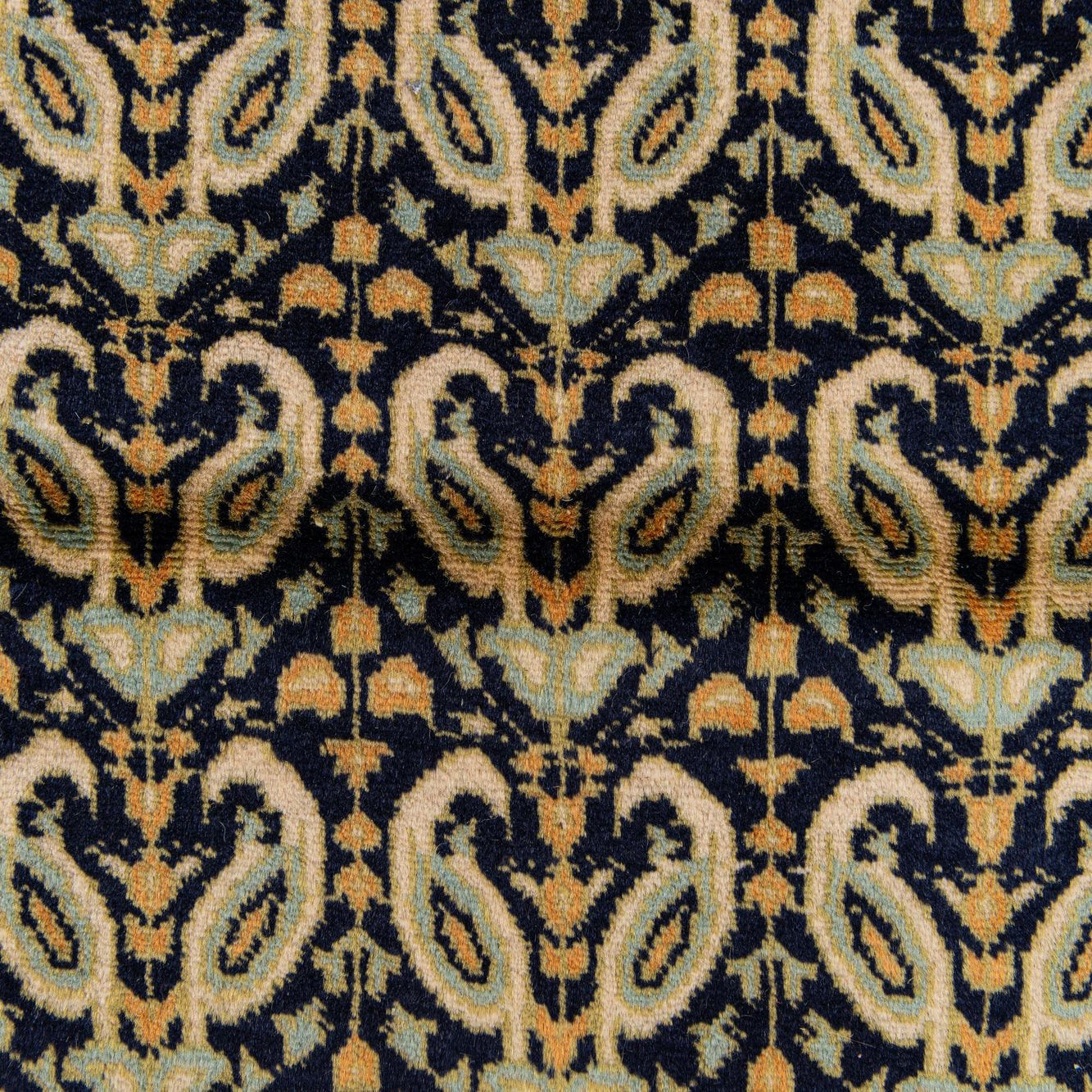 Primary color is Navy Blue. Colors in this rug include: Navy Blue, Ivory, Light Green, Gold.