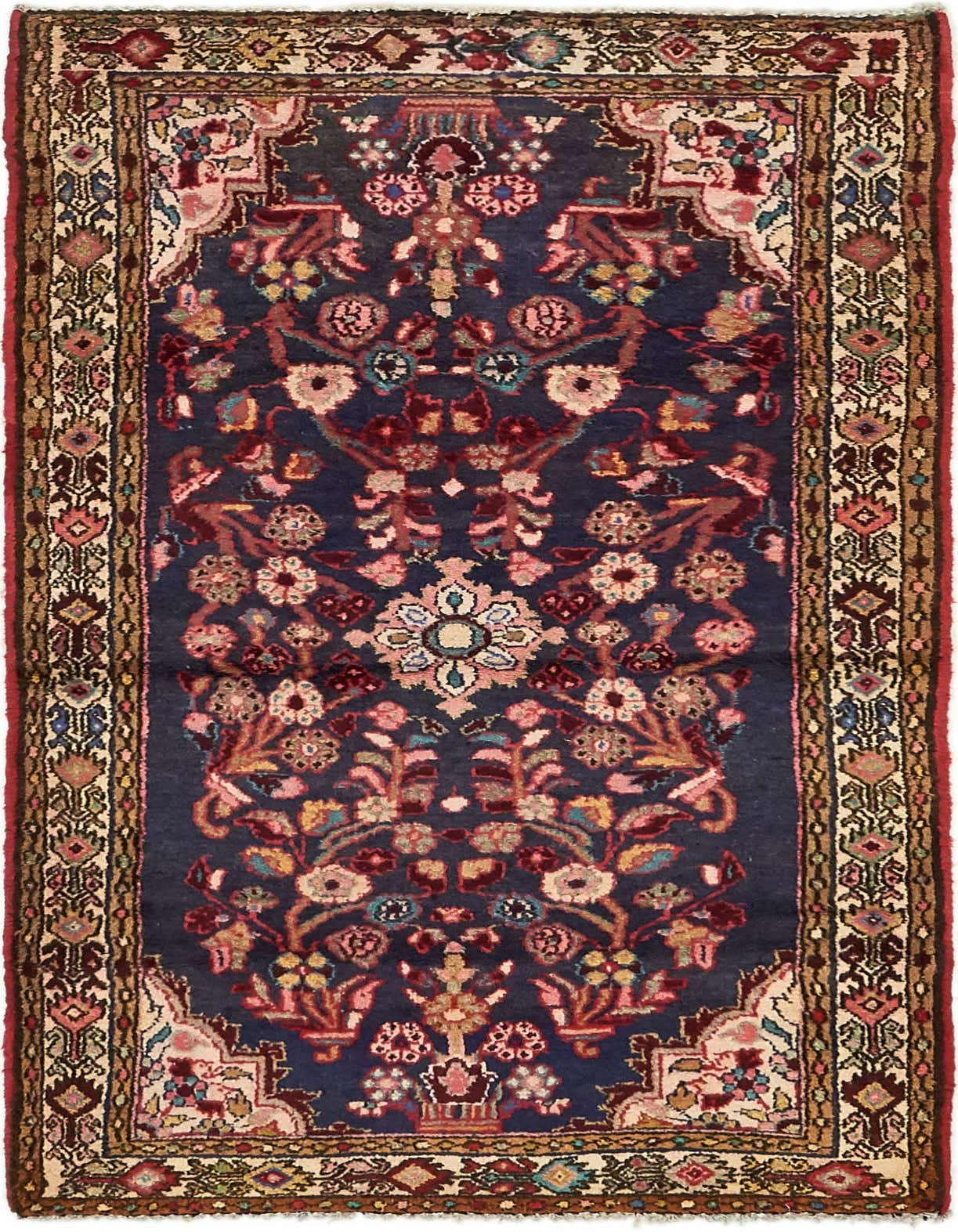 Primary color is Navy Blue. Colors in this rug include: Navy Blue, Ivory, Red, Blue, Olive.