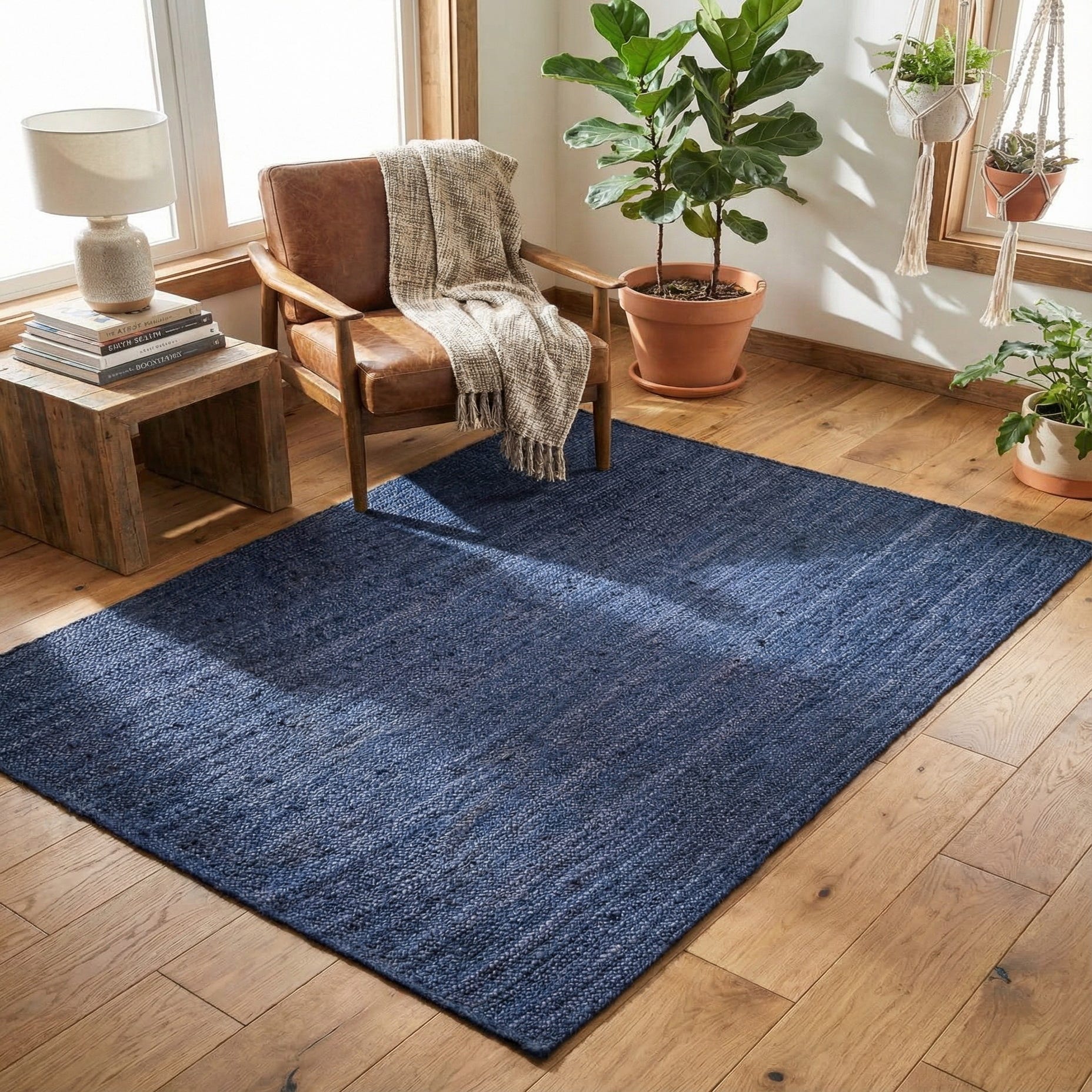 Hand-braided from 100% jute, this navy blue rug presents a clean, linear braided pattern that gives the surface a subtly ribbed texture. The tight braids create a low-profile, slightly nubby feel underfoot while tonal variation and small flecks of natural fiber show through the deep navy, adding visual depth without overpowering a room.