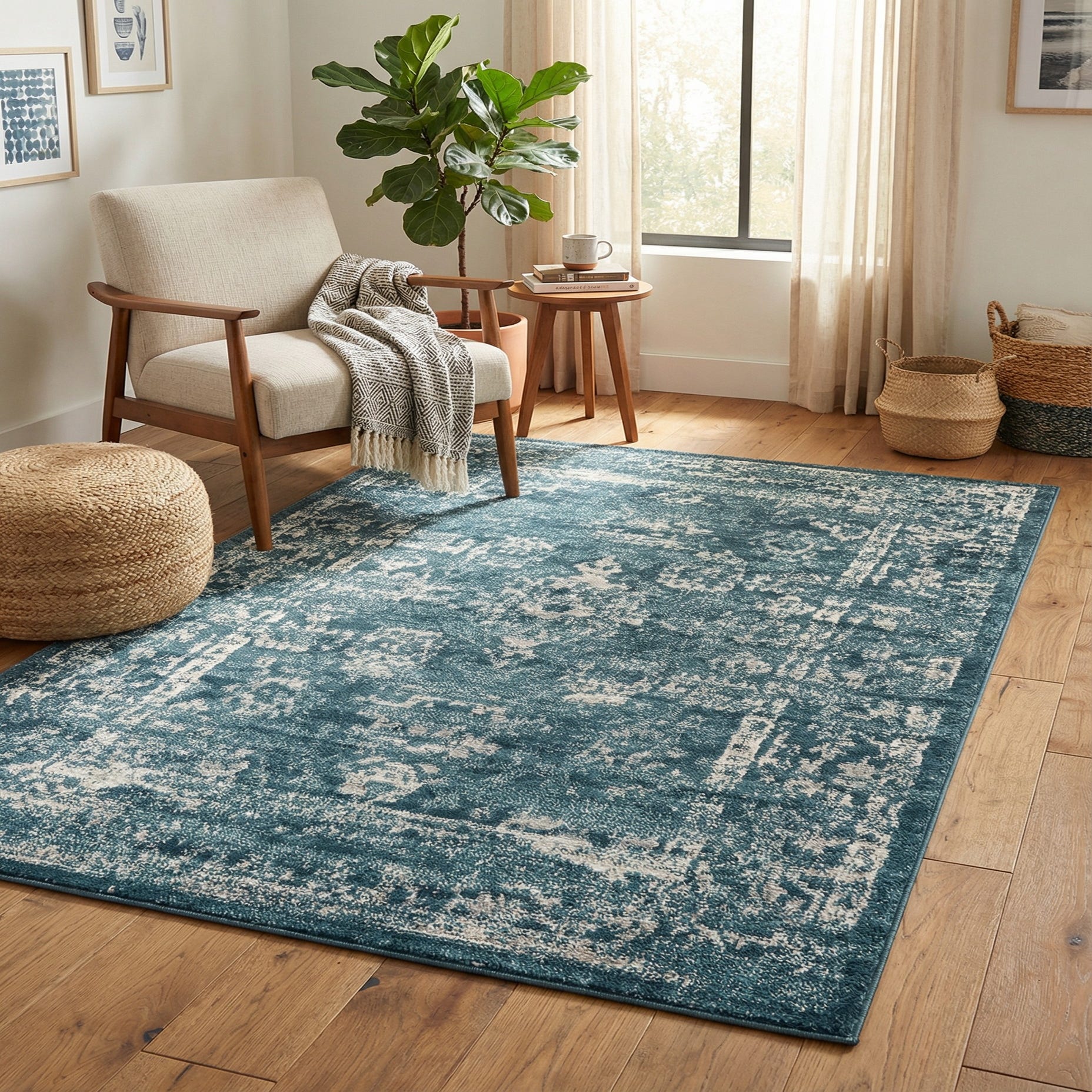 Machine made of 100% polypropylene, this rug delivers consistent construction and an easygoing hand underfoot. It works well in smaller seating areas, a cozy living room vignette, an entryway, or layered at the foot of a bed. Style it with light- to mid-toned woods, ivory linens, and brushed metal accents for a coastal or transitional scheme, or pair with gray upholstery and navy throw pillows for a more contemporary approach.