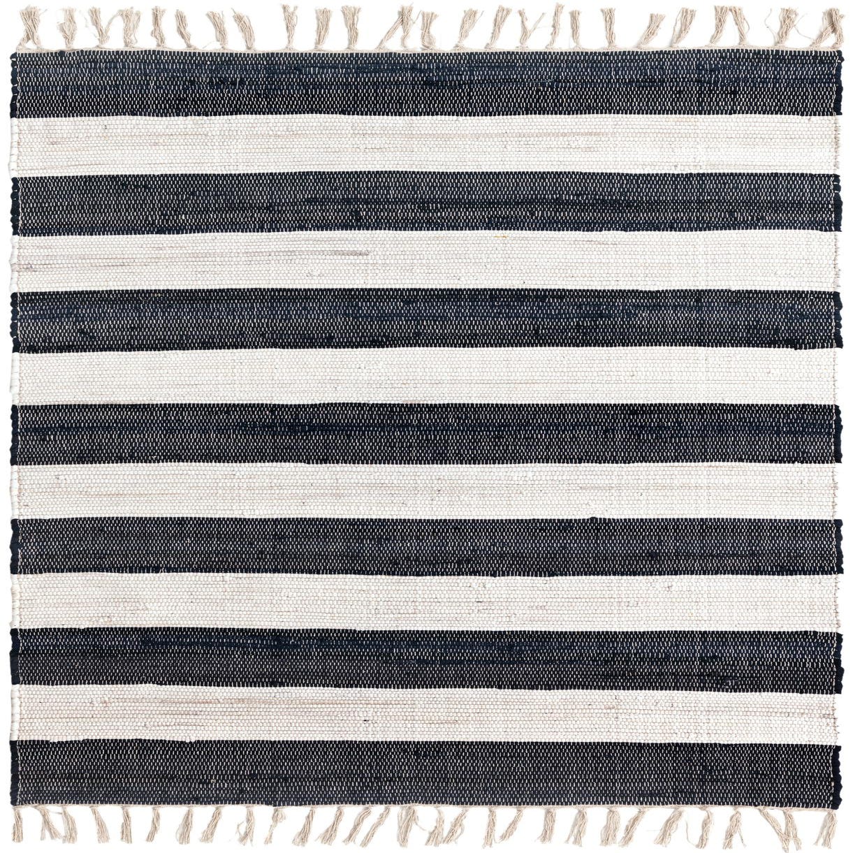 Hand-woven of 100% cotton, this flatweave rug pairs a deep navy background with wide ivory bands for a clean, striped pattern. The surface has a tactile, slubby feel with visible cotton slubs and subtle irregularities that reflect the weaving process, and tasseled ends add a casual finishing touch. The navy field anchors the design while the ivory stripes keep the look fresh and simple.
