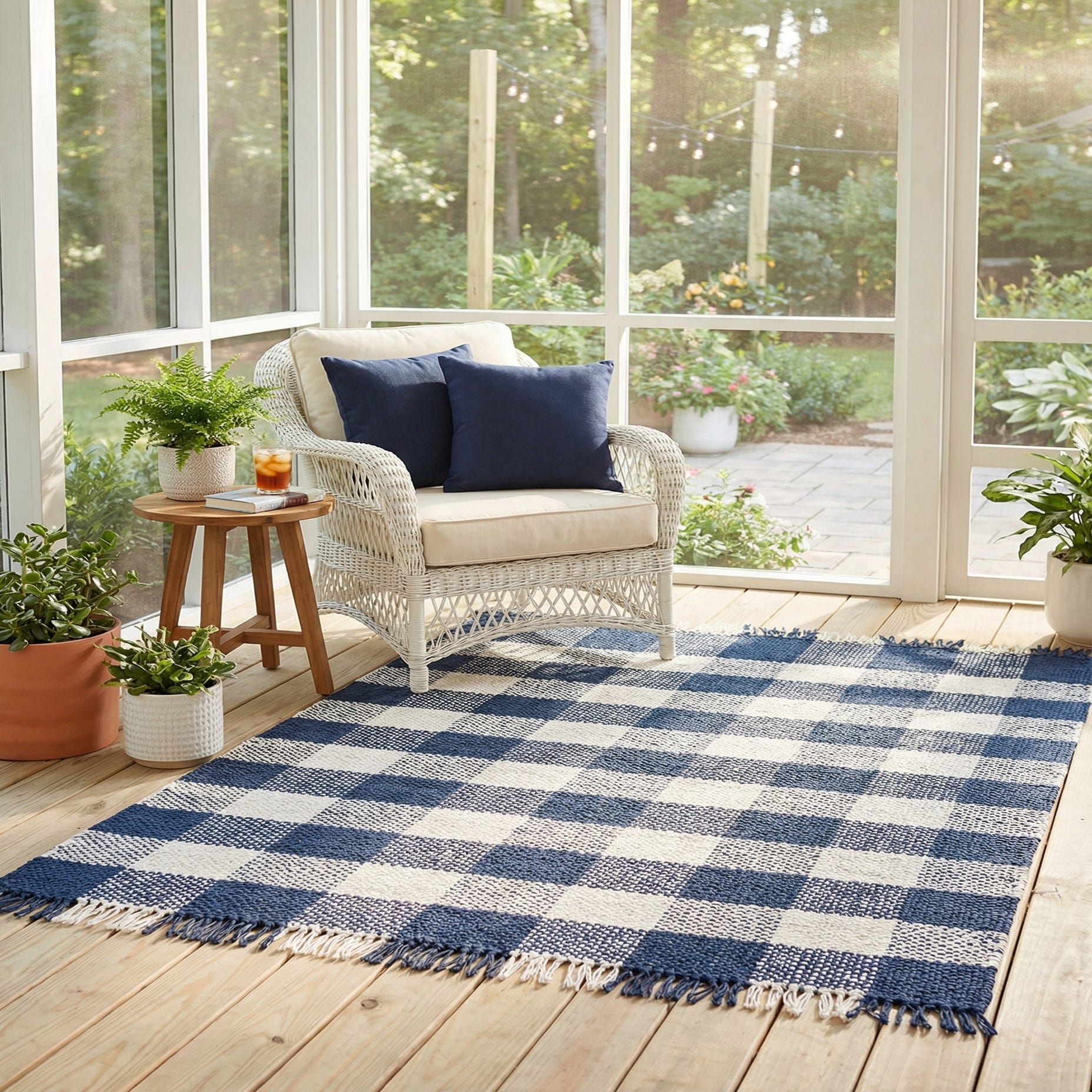 A classic buffalo-check pattern in navy blue and ivory gives this rug a clean, timeless look. The navy-blue background anchors the design while the alternating ivory squares and open-weave accents create a lively, checked grid. Short fringes at either end provide a relaxed finishing detail that complements the pattern without adding bulk.