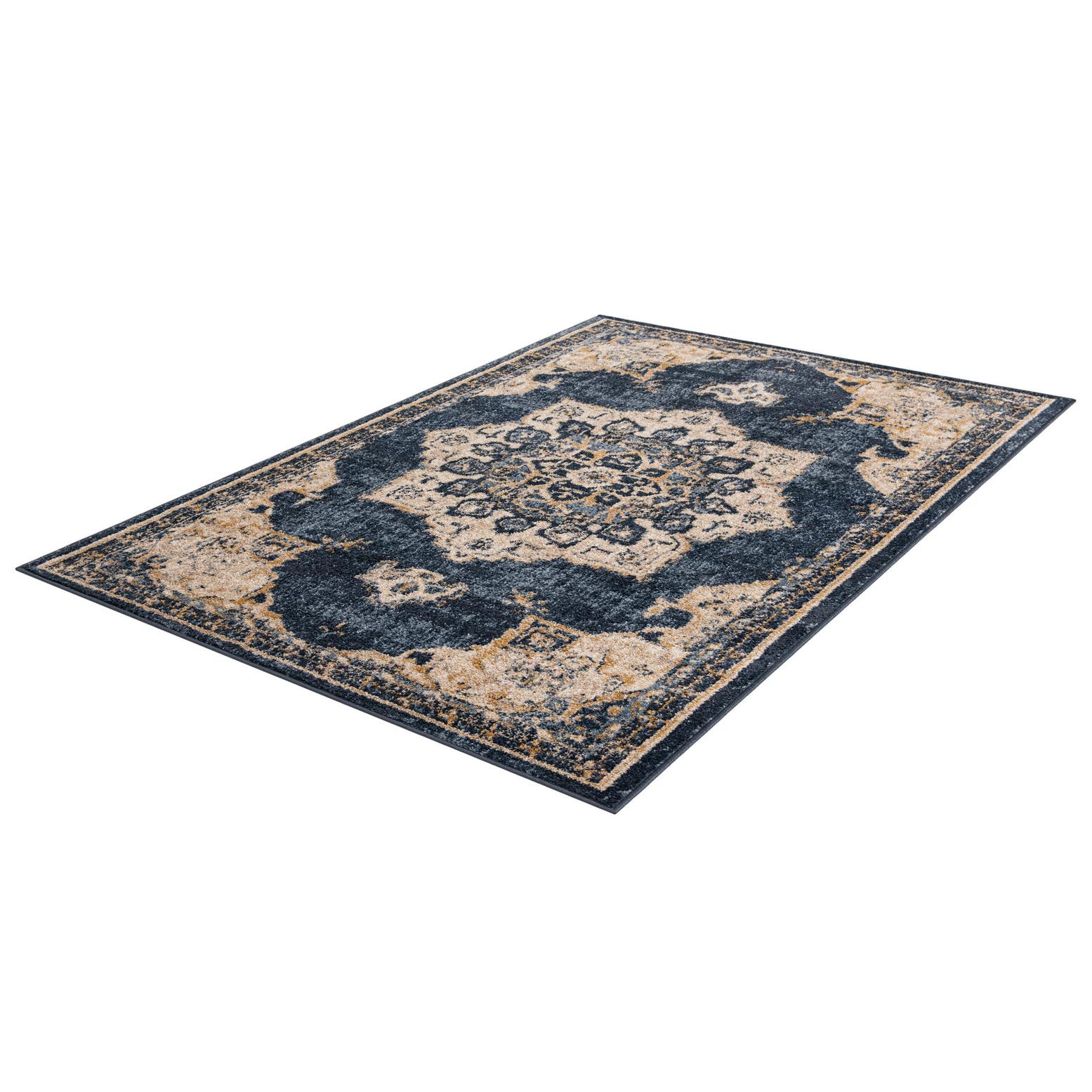 A vintage-inspired central medallion and surrounding arabesque motifs sit against a deep navy background, creating a composed, layered pattern with an intentionally distressed look. Beige and ivory form the primary ornamentation while touches of gold and light blue highlight the detailing and add subtle contrast. The surface has a low, dense pile that feels smooth and slightly cushioned underfoot; machine-made from 100% polypropylene, the construction produces a uniform texture with a soft hand and muted sheen.