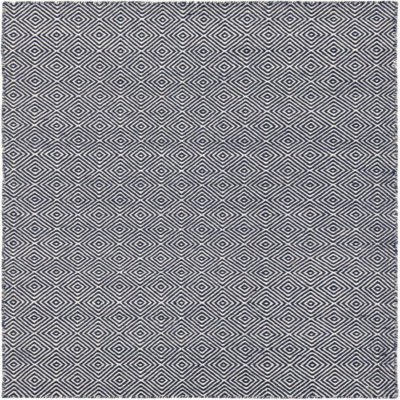 A 4x6 rectangular navy blue and white flatweave rug with a repeating modern trellis diamond pattern, suitable for various indoor rooms.