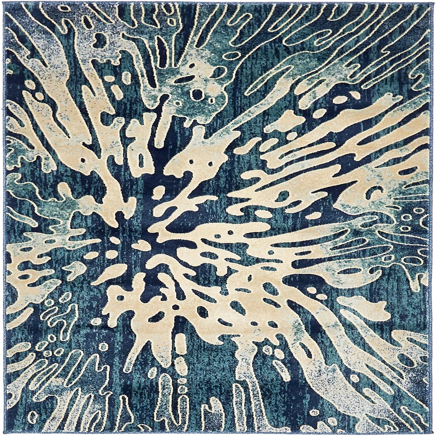Primary color is Navy Blue. Colors in this rug include: Navy Blue, Beige, Tan, Light Blue.