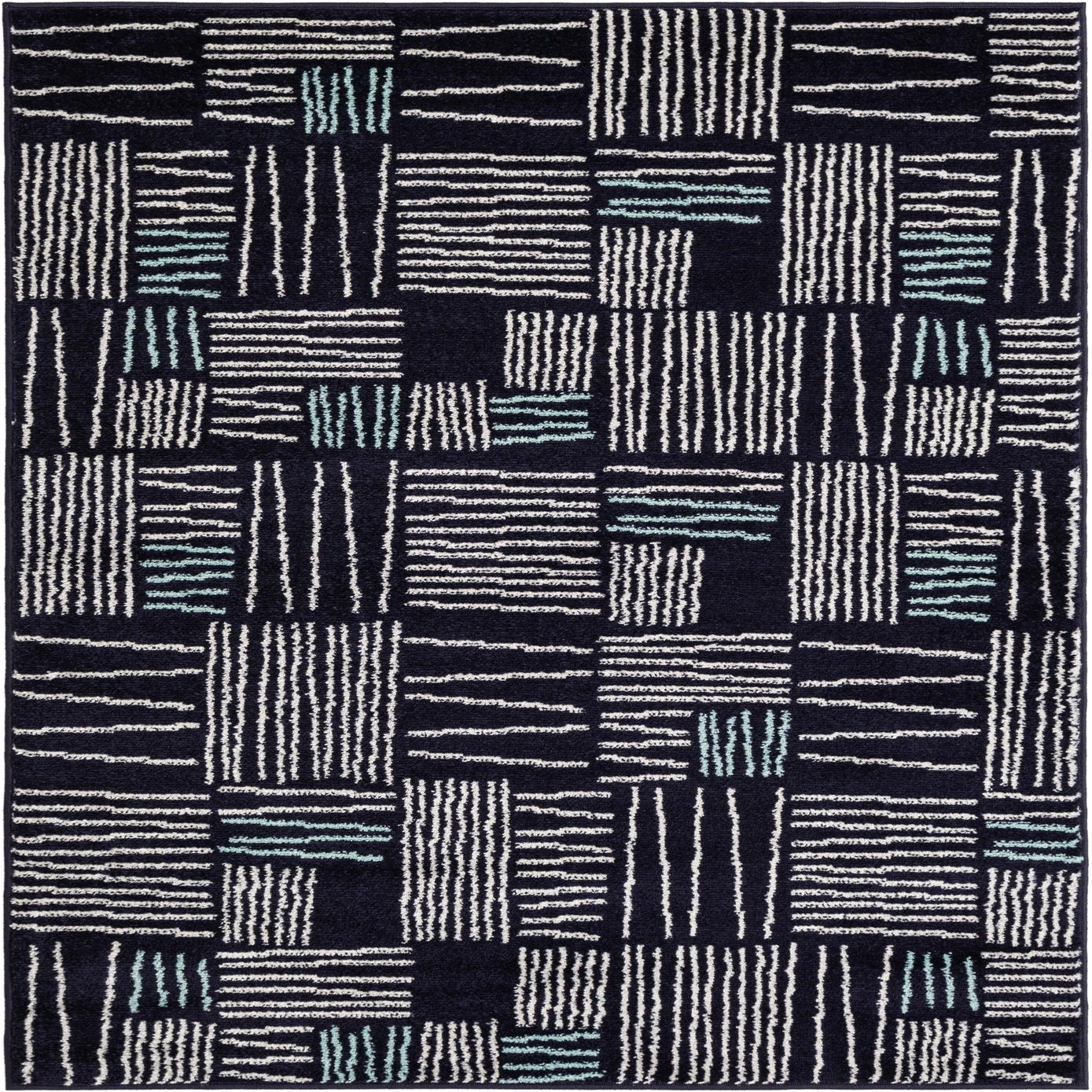 A graphic grid of irregular rectangles and linear stripes gives this rug a modern, architectural look. Deep navy provides the background while ivory stripes form dense and airy bands, and pops of light blue add subtle contrast. Raised linear motifs alternate with low pile areas, creating a tactile surface with visible texture and a soft, slightly cushioned feel underfoot. Machine made from 100% polypropylene for consistent construction and easy placement.